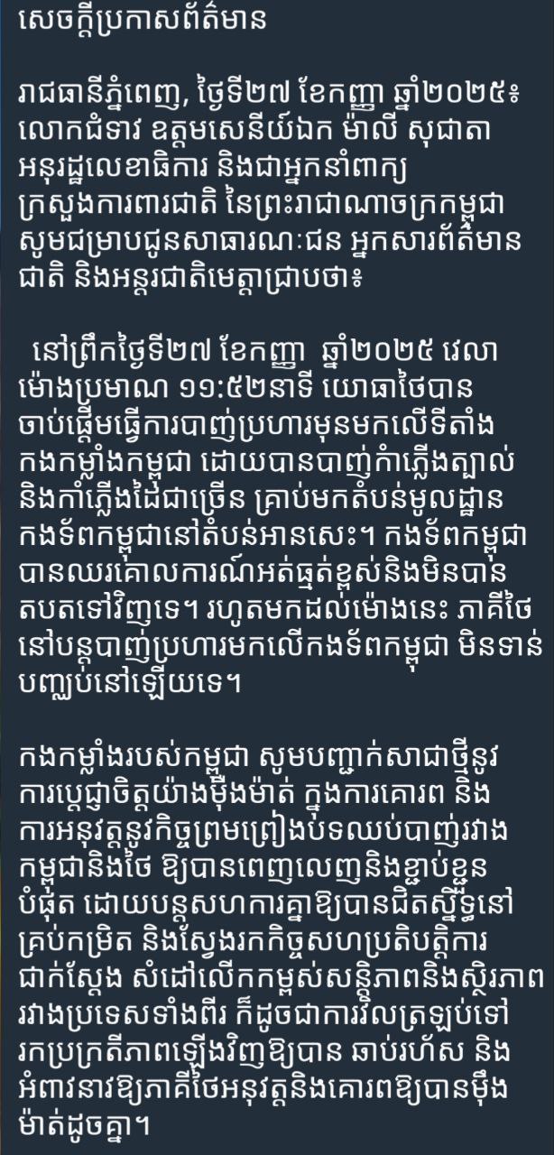 នៅព្រឹកថ្ងៃទី២៧ ខែកញ្ញា ឆ្នាំ២០២៥ វេលាម៉ោងប្រមាណ ១១:៥២នាទី យោធាថៃបានចាប់ផ្តើមធ្វើការបាញ់ប្រហារមុនមកលើទីតាំងកងកម្លាំងកម្ពុជា ដោយបានបាញ់កំាភ្លើងត្បាល់និងកាំភ្លើងដៃជាច្រើន គ្រាប់មកតំបន់មូលដ្ឋានកងទ័ពកម្ពុជានៅតំបន់អានសេះ។