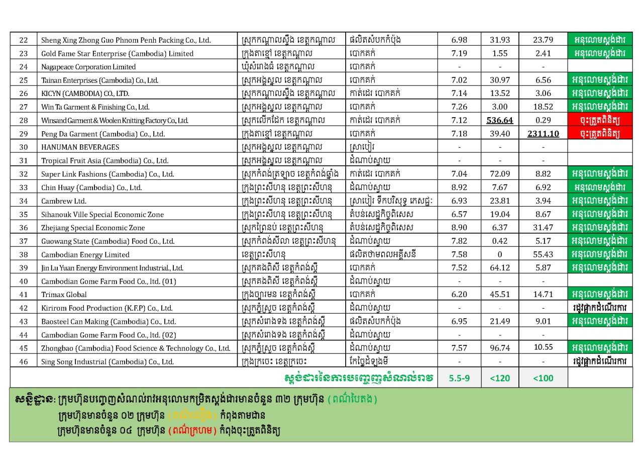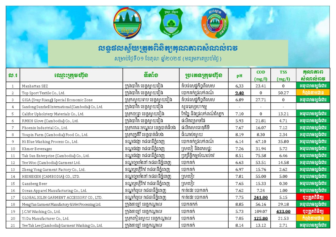 «គិតត្រឹមថ្ងៃទី៣០ ខែកញ្ញា ឆ្នាំ២០២៥ ក្រុមហ៊ុន និងរោងចក្រ ចំនួន ៥៧ ទីតាំង បានចុះកិច្ចសន្យា ដើម្បីអនុវត្តច្បាប់ត្រឹមត្រូវ និងបានបំពាក់ឧបរណ៍ស្វ័យត្រួតពិនិត្យ ក្នុងនោះ មានក្រុមហ៊ុន និងសហគ្រាស ចំនួន ៤៦ បានបំពាក់រួចហើយ»។ នេះបើតាមការបញ្ជាក់របស់អ្នកនាំពាក្យក្រសួងបរិស្ថាន។