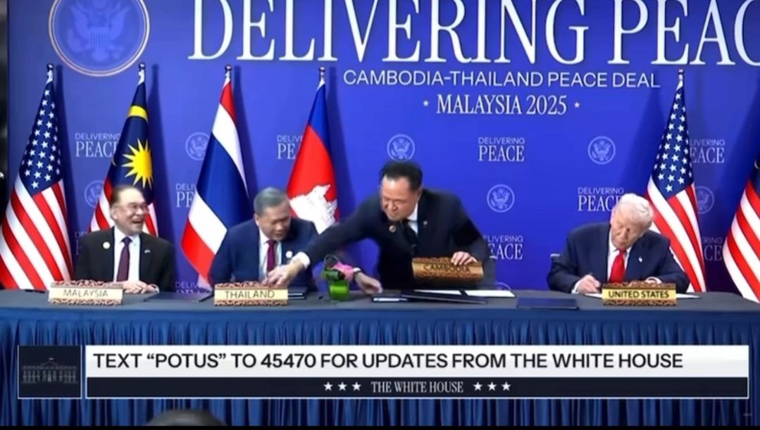 ផ្ទុះការរិះគន់ដូចទឹកបាក់ទំនប់ អំឡុងពេលចុះហត្ថលេខាលើកិច្ចព្រមព្រៀងសន្តិភាព កម្ពុជា-ថៃ ដោយមានវត្តមានប្រធានាធិបតីអាមេរិក លោក ដូណាល់ ត្រាំ និងប្រធានប្ដូរវេនអាស៊ាន ជាសាក្សី លោក អានុទីន ឆានវីរ៉ាក់គុល នាយករដ្ឋមន្រ្តីថៃ ស្រាប់តែសូម សម្ដេច ហ៊ុន ម៉ាណែត ប្ដូរទីតាំងអង្គុយជិត លោក ត្រាំ យ៉ាងរំភើយដោយគ្មានខ្វល់អ្វី។