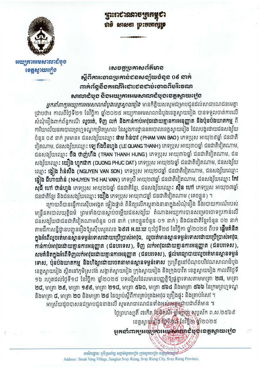 ក្រោយពីបានធ្វើការស៊ើបអង្កេត ផ្ទៀងផ្ទាត់ ពិនិត្យលើភស្តុតាងនានា ក្នុងសំណុំរឿង និងរបាយការណ៍របស់មន្ត្រីនគរបាលយុត្តិធម៌ ព្រមទាំងបានស្តាប់ចម្លើយជនសង្ស័យ តំណាងអយ្យការបានសម្រេចចោទប្រកាន់លើ ជនសង្ស័យជាជនជាតិវៀតណាម ចំនួន ០៧ នាក់ (គេចខ្លួនចំនួន ០១ នាក់) និងជនជាតិខ្មែរ ចំនួន ០២ នាក់ តាមដីកាសន្និដ្ឋានបញ្ជូនរឿងឱ្យស៊ើបសួរលេខ ៦៩៧ អ.យ.ឃ ចុះថ្ងៃទី២៥ ខែវិច្ឆិកា ឆ្នាំ២០២៥ ពីបទ៖ «ផ្តើមគំនិត ក្នុងអំពើលួចរត់មានស្ថានទម្ងន់ទោសដោយប្រើប្រាស់អាវុធ, លួចរត់មានស្ថានទម្ងន់ទោសដោយប្រើប្រាស់អាវុធ, កាន់កាប់អាវុធដោយគ្មានការអនុញ្ញាត (ជនបរទេស), ទិញ លក់អាវុធដោយគ្មានការអនុញ្ញាត (ជនបរទេស), សមគំនិតក្នុងអំពើទិញលក់អាវុធដោយគ្មានការអនុញ្ញាត (ជនបរទេស), ផ្តល់មធ្យោបាយលួចរត់មានស្ថានទម្ងន់ ទោស, ប៉ុនប៉ងឃាតកម្ម និងហិង្សាដោយចេតនាមានស្ថានទម្ងន់ទោស ប្រព្រឹត្តនៅចំណុចបរិវេណសាលាដំបូងខេត្តស្វាយរៀង ស្ថិតនៅភូមិស្រះវង់ សង្កាត់ស្វាយរៀង ក្រុងស្វាយរៀង និងក្រុងបាវិត ខេត្តស្វាយរៀង កាលពីថ្ងៃទី ១៦ រហូតដល់ថ្ងៃទី១៨ ខែវិច្ឆិកា ឆ្នាំ២០២៥ បទល្មើសដែលមានបញ្ញត្តិឱ្យផ្តន្ទាទោសតាមមាត្រា ២៧, មាត្រា ២៨, មាត្រា ២៩, មាត្រា ១៩៩, មាត្រា ២១៨, មាត្រា ៥៦០, មាត្រា ៥៦៤ និងមាត្រា ៥៦៦ នៃក្រមព្រហ្មទណ្ឌ និងមាត្រា ៨, មាត្រា ២០ និងមាត្រា ២៤ នៃច្បាប់ស្តីពីការគ្រប់គ្រងអាវុធ គ្រឿងផ្ទុះ និងគ្រាប់រំសេវ។