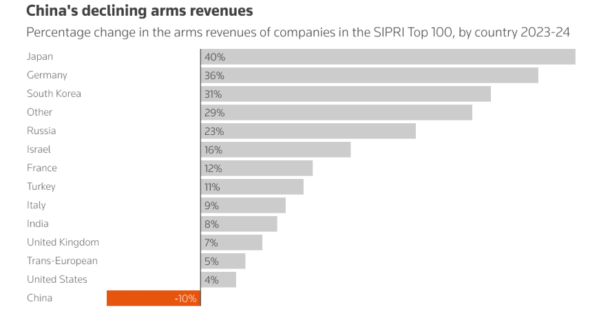 ទិន្នន័យស្រាវជ្រាវពី SIPRI បង្ហាញថា ប្រាក់ចំណូលរបស់ក្រុមហ៊ុនយោធាធំៗរបស់ចិនបានធ្លាក់ចុះ ១០% ក្នុងឆ្នាំមុន ខណៈជប៉ុនកើនឡើង ៤០% អាល្លឺម៉ង់ ៣៦% និងសហរដ្ឋអាមេរិក ៣.៨%។ របាយការណ៍ក៏បង្ហាញថា ប្រាក់ចំណូលរួមរបស់ក្រុមហ៊ុនអាវុធធំៗ 100 ទូទាំងពិភពលោកបានកើនឡើង 5.9% ទៅដល់កម្រិតកំណត់ត្រា 679 ពាន់លានដុល្លារ។