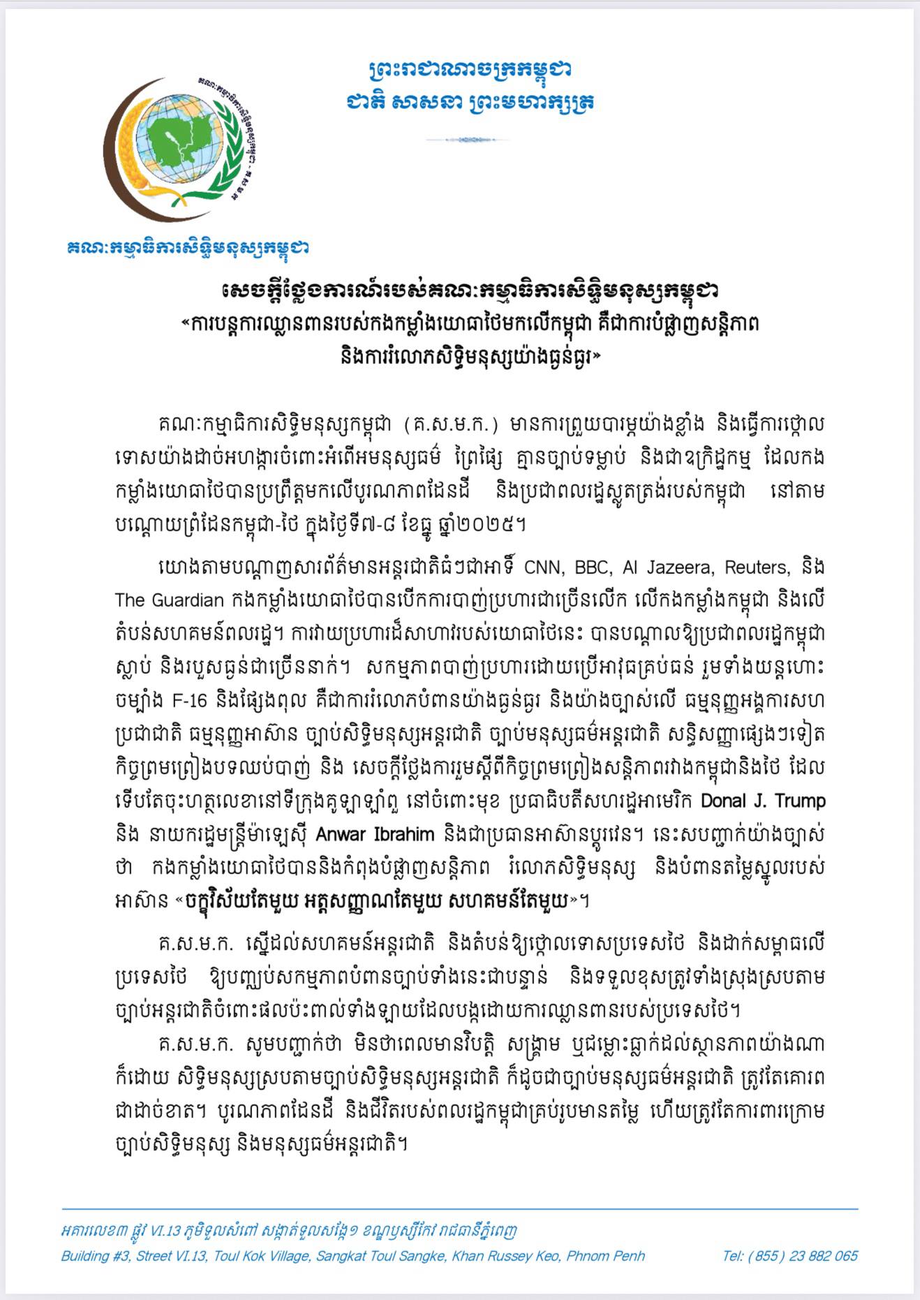សកម្មភាពបាញ់ប្រហារដោយប្រើអាវុធគ្រប់ធន់ រួមទាំងយន្តហោះចម្បាំង F-16 និងផ្សែងពុល គឺជាការរំលោភបំពានយ៉ាងធ្ងន់ធ្ងរ និងយ៉ាងច្បាស់លើធម្មនុញ្ញអង្គការសហប្រជាជាតិ ធម្មនុញ្ញអាស៊ាន ច្បាប់សិទ្ធិមនុស្សអន្តរជាតិ ច្បាប់មនុស្សធម៌អន្តរជាតិ សន្ធិសញ្ញាផ្សេងៗទៀត កិច្ចព្រមព្រៀងបទឈប់បាញ់ និងសេចក្តីថ្លែងការរួមស្តីពីកិច្ចព្រមព្រៀងសន្តិភាពរវាងកម្ពុជា និងថៃ ដែលទើបតែចុះហត្ថលេខានៅទីក្រុងគូឡាឡាំពួ នៅចំពោះមុខ ប្រធាធិបតីសហរដ្ឋអាមេរិក Donal J. Trump និង នាយករដ្ឋមន្ត្រីម៉ាឡេស៊ី Anwar Ibrahim និងជាប្រធានអាស៊ានប្តូរវេន។