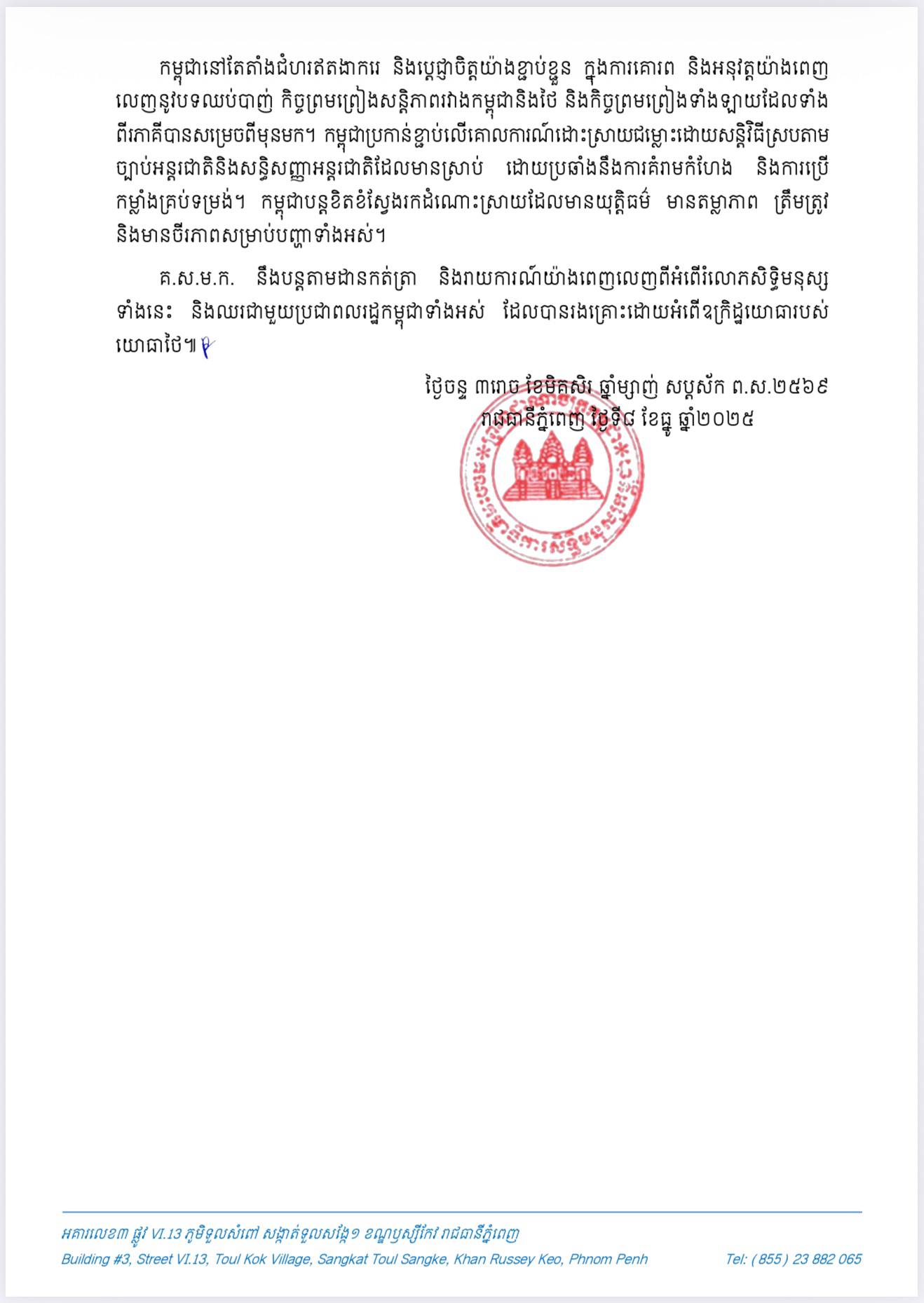 គ.ស.ម.ក. សូមបញ្ជាក់ថា “មិនថាពេលមានវិបត្តិសង្គ្រាម ឬជម្លោះធ្លាក់ដល់ស្ថានភាពយ៉ាងណាក៏ដោយ សិទ្ធិមនុស្សស្របតាមច្បាប់សិទ្ធិមនុស្សអន្តរជាតិ ក៏ដូចជាច្បាប់មនុស្សធម៌អន្តរជាតិ ត្រូវតែគោរពជាដាច់ខាត។ បូរណភាពដែនដី និងជីវិតរបស់ពលរដ្ឋកម្ពុជាគ្រប់រូបមានតម្លៃ ហើយត្រូវតែការពារក្រោមច្បាប់សិទ្ធិមនុស្ស និងមនុស្សធម៌អន្តរជាតិ”។