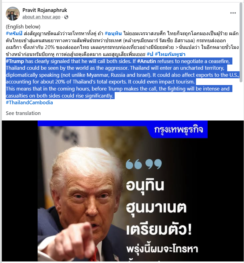 អ្នកកាសែតជើងចាស់រូបនេះ បានសរសេរបង្ហោះការរិះគន់ចំៗមិនសំច្ចៃមាត់ ថា ប្រសិនបើនាយករដ្ឋមន្ត្រីថៃ លោក Anutin បដិសេធមិនចរចារកិច្ចព្រមព្រៀងឈប់បាញ់ជាមួយកម្ពុជា នោះប្រទេសថៃអាចត្រូវបានពិភពលោកមើលឃើញថា ថៃជាអ្នកឈ្លានពានលើកម្ពុជា។ ជាពិសេសថៃខ្លួនឯងនិងដើរផ្លូវទាល់ច្រក ផ្នែកការទូត មិនខុសពីករណីប្រទេសមីយ៉ាន់ម៉ា រុស្ស៊ី និងអ៊ីស្រាអែល នោះឡើយ។ ថៃក៏អាចប្រឈមមុខនិងប៉ះពាល់ដល់ការនាំចេញរបស់ថៃទៅកាន់ទីផ្សារសហរដ្ឋអាមេរិកបន្ថែមទៀត ព្រោះបច្ចុប្បន្ននេះការនាំចេញសរុបរបស់ថៃមានចំនួនប្រហែល20% ហើយជាពិសេសថែមទាំងអាចប៉ះពាល់ដល់វិស័យទេសចរណ៍ទៀតផង។