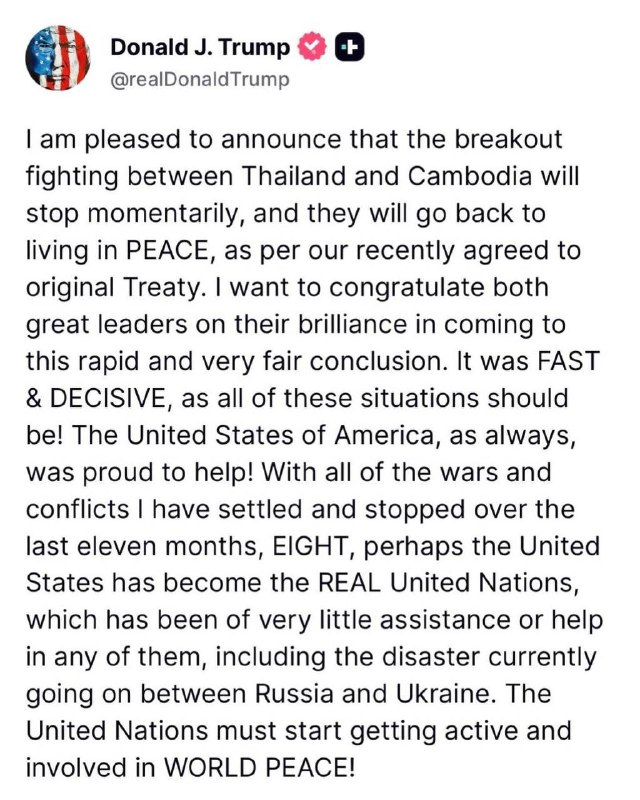 អាមេរិច ៖ លោក ត្រាំ អបអរសាទនិងមានមោទកភាពក្នុងការជួយសម្របសម្រួលបញ្ចប់ជម្លោះការធ្វើសង្រ្គាមស៊ីសាច់ហុតឈាមគ្នារវាង កម្ពុជា-ថៃ ដោយដឹកដៃប្រទេសទាំងពីរឲ្យចូលតុចរចារ ត្រឡប់ទៅរកសន្តិភាពវិញ ដោយអនុលោមតាមសេចក្ដីថ្លែងការរួមស្ដីពីកិច្ចព្រមព្រៀងសន្តិភាពកម្ពុជា ថៃ នៅទីក្រុងកូឡាឡាំពួ រួមទាំងជម្លោះ និងសង្គ្រាមផ្សេងទៀតចំនួន០៨  ត្រឹមរយៈពេល១១ខែចុងក្រោយនេះ នៅក្នុងពិភពលោក។