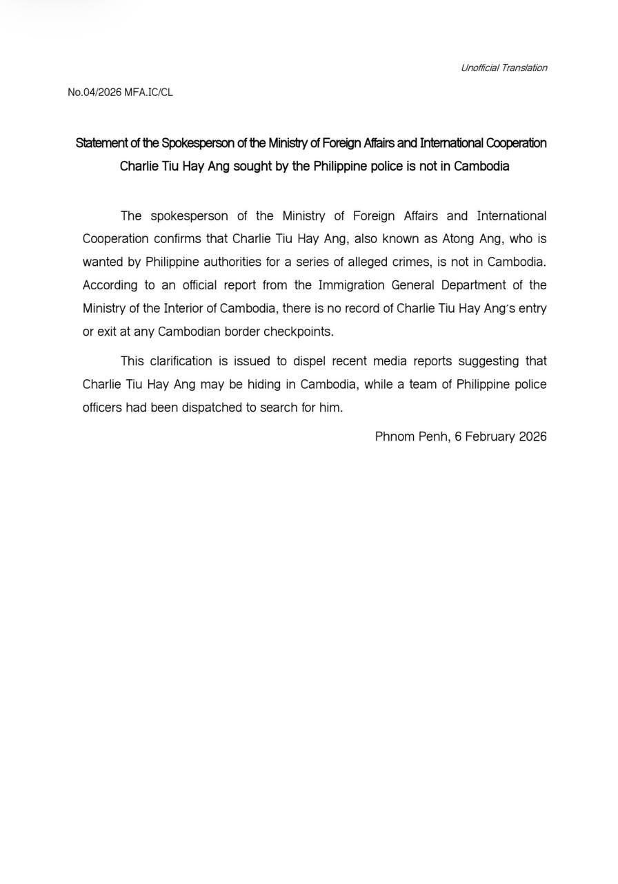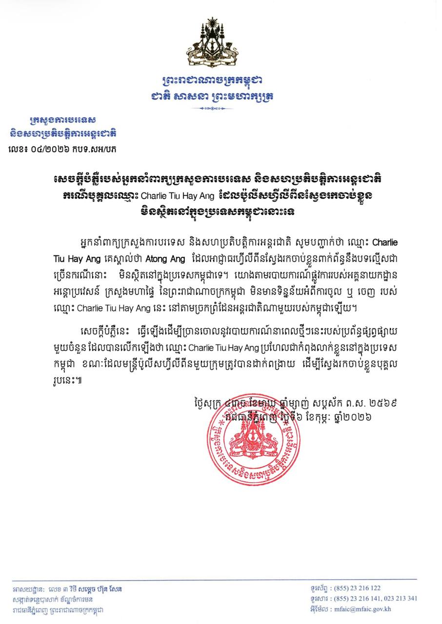 ភ្នំពេញ៖ ក្រសួងការបរទេស និងសហប្រតិបត្តិការអន្តរជាតិ បានចេញសេចក្តីបំភ្លឺផ្លូវការ ថា បុគ្គលឈ្មោះ ឆាលី ទ្យូ ហៃ អាង (Charlie Tiu Hay Ang) ដែលគេស្គាល់ថា អាតុងអាង «Atong Ang» ជាមហាសេដ្ឋីល្បែងស៊ីសង និងជាប់ពាក់ព័ន្ធបទល្មើសឧក្រិដ្ឋជាច្រើនករណី មិនស្ថិតនៅក្នុងប្រទេសកម្ពុជានោះទេ។