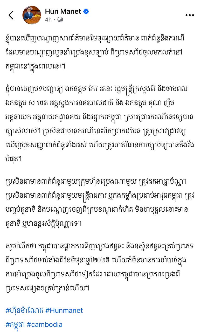 នៅព្រឹកថ្ងៃទី០៣ ខែមេសា ២០២៦នេះ សម្ដេច ហ៊ុន ម៉ាណែត បានង្ហោះសារនៅលើបណ្ដាញ Facebook ថា ៖ ខ្ញុំបានឃើញបណ្ដាញសារព័ត៌មានថៃចុះផ្សាយព័ត៌មាន ពាក់ព័ន្ធ នឹងករណីដែលមានបណ្ដាញលួចនាំប្រេងខុសច្បាប់ ពីប្រទេសថៃចូលមកលក់នៅកម្ពុជានៅក្នុងពេលនេះ។