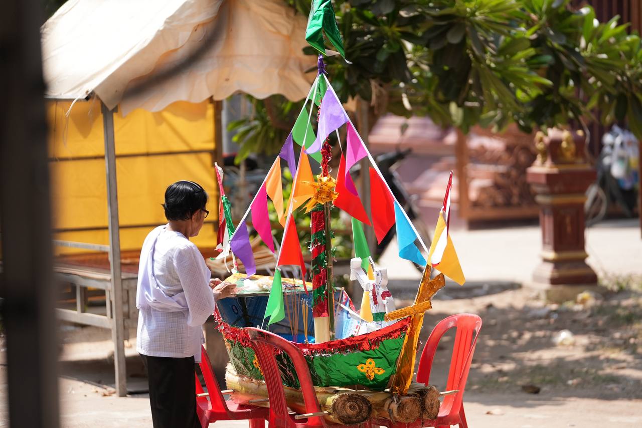ទន្ទឹមពេលនោះ ចាស់ទុំដឹកនាំយកដើមចេកមកធ្វើសំពៅ ខ្លះហៅ «សង្ឃឹក» ហើយតុបតែង ដាក់តង្វាយផ្សេងៗមានបាយ ម្ហូប នំចំណី ផ្លែឈើ ម្លូស្លា ស្រាស និងផ្កាភ្ញីជាដើម។ បន្ទាប់ពីព្រះសង្ឃឆាន់ចប់សព្វគ្រប់ អ្នកស្រុកនាំគ្នាអុជធូបអុជទៀនដោតនៅលើសំពៅនោះ បួងសួងសុំសេចក្តីសុខចម្រើនរៀងៗខ្លួន ជាពិសេស គឺសូមកុំឲ្យអស់លោកបង់បត់ និងបារមីប្រចាំវត្ត កុំបីមានប្រកាន់ខឹងនឹងកូនចៅ បើទោះខុសឆ្គងដោយប្រការផ្សេងៗ រួមទាំងការសម្តែងថ្វាយក្នុងរាត្រីកន្លងទៅមិនល្អ ឬភ្លាំងភ្លេចក្តី។