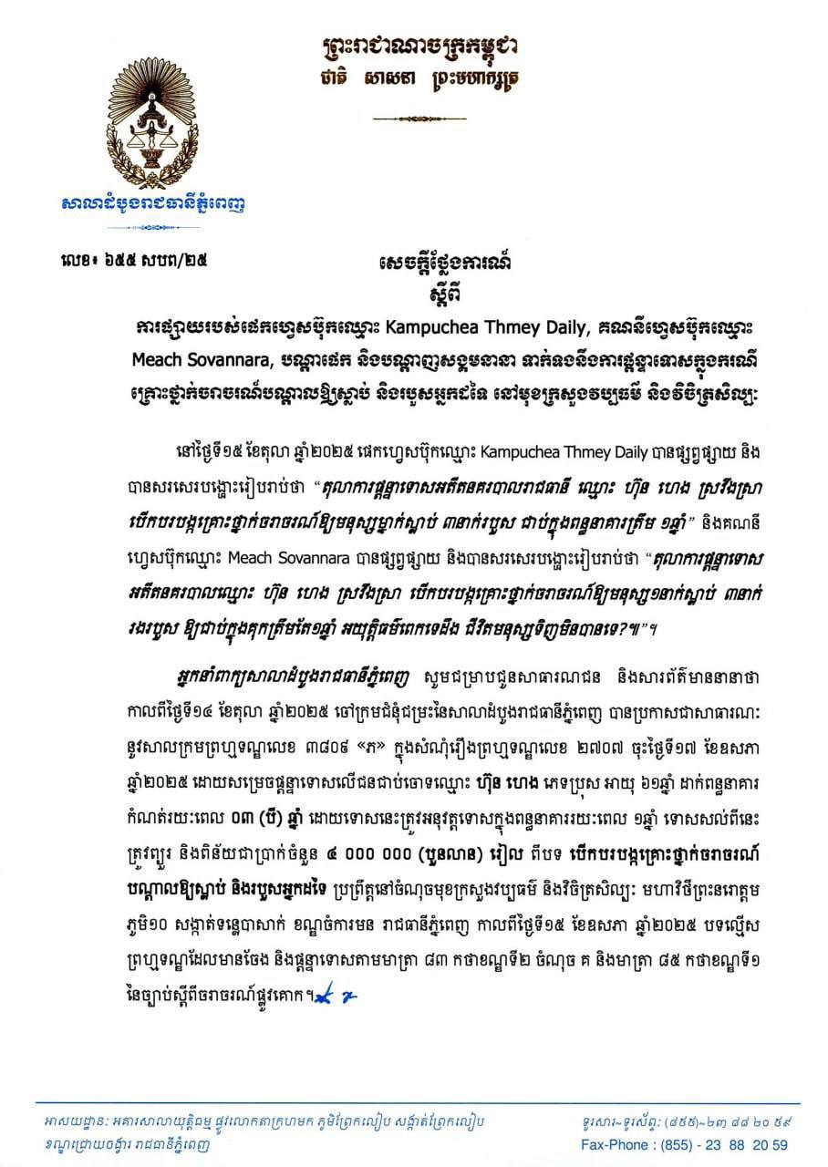 កាលពីថ្ងៃអាទិត្យ ទី១៥ ខែតុលា អ្នកនាំពាក្យសាលាដំបូងរាជធានីភ្នំពេញ បានលើកឡើងថា កាលពីថ្ងៃទី១៤ ខែតុលា ឆ្នាំ២០២៥ ចៅក្រមជំនុំជម្រះនៃសាលាដំបូងរាជធានីភ្នំពេញ បានប្រកាសជាសាធារណៈ នូវសាលក្រមព្រហ្មទណ្ឌលេខ ៣៨០៩ «ភ» ក្នុងសំណុំរឿងព្រហ្មទណ្ឌលេខ ២៧០៧ ចុះថ្ងៃទី១៧ ខែឧសភា ឆ្នាំ២០២៥ ដោយសម្រេចផ្តន្ទាទោស លើជនជាប់ចោទឈ្មោះ ហ៊ុន ហេង ភេទប្រុស អាយុ ៦១ឆ្នាំ ដាក់ពន្ធនាគារកំណត់រយៈពេល ០៣ (បី) ឆ្នាំ ដោយទោសនេះត្រូវអនុវត្តទោសក្នុងពន្ធនាគាររយៈពេល ១ឆ្នាំ ទោសសល់ពីនេះ ត្រូវព្យួរ និងពិន័យជាប្រាក់ ចំនួន ៤ លានរៀល ពីបទ៖ «បើកបរបង្កគ្រោះថ្នាក់ចរាចរណ៍ បណ្តាលឱ្យស្លាប់ និងរបួសអ្នកដទៃ » ប្រព្រឹត្តនៅចំណុច មុខក្រសួងវប្បធម៌ និងវិចិត្រសិល្បៈ មហាវិថីព្រះនរោត្តម ភូមិ១០ សង្កាត់ទន្លេបាសាក់ ខណ្ឌចំការមន រាជធានីភ្នំពេញ កាលពីថ្ងៃទី១៥ ខែឧសភា ឆ្នាំ២០២៥ បទល្មើស ព្រហ្មទណ្ឌដែលមានចែង និងផ្តន្ទាទោសតាមមាត្រាa ៨៣ កថាខណ្ឌទី២ ចំណុច គ និងមាត្រា ៨៥ កថាខណ្ឌទី១ នៃច្បាប់ស្តីពីចរាចរណ៍ផ្លូវគោក។