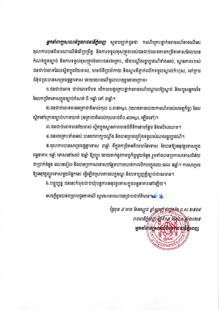 សាលាដំបូងរាជធានីភ្នំពេញ បានពន្យល់ថា ករណីគ្រោះថ្នាក់ចរាចរណ៍ខាងលើនេះ តុលាការបានពិចារណាលើអំពើប្រព្រឹត្ត និងការទទួលខុសត្រូវរបស់ជនជាប់ចោទតាមកម្រិតទោសដែលមាន កំណត់ក្នុងច្បាប់ និងការទទួលខុសត្រូវចំពោះជនរងគ្រោះ, ដើមបណ្តឹងរដ្ឋប្បវេណីទាំងអស់, ស្ថានភាពរបស់ ជនជាប់ចោទដែលស្ថិតក្នុងវ័យចាស់, មានជំងឺប្រចាំកាយ និងស្មារតីភ្ញាក់រលឹកទទួលស្គាល់កំហុស, ចៅក្រមជំនុំជម្រះបានសម្រេចផ្តន្ទាទោស ជនជាប់ចោទ ជាប់ចោទពីបទ៖ «បើកបរបង្កគ្រោះថ្នាក់ចរាចរណ៍បណ្តាលឱ្យស្លាប់ និងរបួសអ្នកដទៃ ដែលកម្រិតទោសក្នុងច្បាប់កំណត់ ពី ១ឆ្នាំ ទៅ ៣ឆ្នាំ។ ជនជាប់ចោទមានអត្រាជាតិអាល់កុល ០.៣៥Mg/L (យោងតាមរបាយការណ៍របស់សមត្ថកិច្ច) ដែលស្ថិតនៅក្រោមច្បាប់ហាមឃាត់ (អត្រាជាតិអាល់កុលចាប់ពី ០.៤០Mg/L ឡើងទៅ)»។