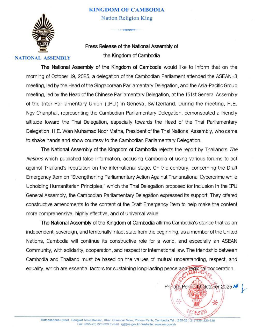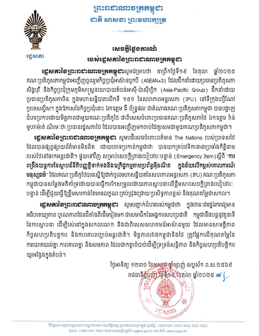 ភ្នំពេញ៖ នៅថ្ងៃអាទិត្យ ទី១៩ ខែតុលានេះ រដ្ឋសភាកម្ពុជា បានបញ្ជាក់ពីការចូលរួមកិច្ចប្រជុំអាស៊ានបូកបី (ASEAN+3) កិច្ចប្រជុំក្រុមភូមិសាស្ត្រនយោបាយតំបន់អាស៊ី-ប៉ាស៊ីហ្វិក (Asia-Pacific Group) ដឹកនាំរបស់គណៈប្រតិភូសភាកម្ពុជា នៅទីក្រុងហ្សឺណែវ ប្រទេសស្វីស នាព្រឹកថ្ងៃទី១៩ ខែតុលា ឆ្នាំ២០២៥ និងបដិសេធចំពោះព័ត៌មាន The Nations របស់ប្រទេសថៃ ដែលបានផ្សព្វផ្សាយព័ត៌មានមិនពិត ដោយចោទប្រកាន់កម្ពុជាថា «បានយកគ្រប់វេទិកានានាប្រឆាំងកិត្តិនាមរបស់ថៃ នៅឆាកអន្តរជាតិ» ។