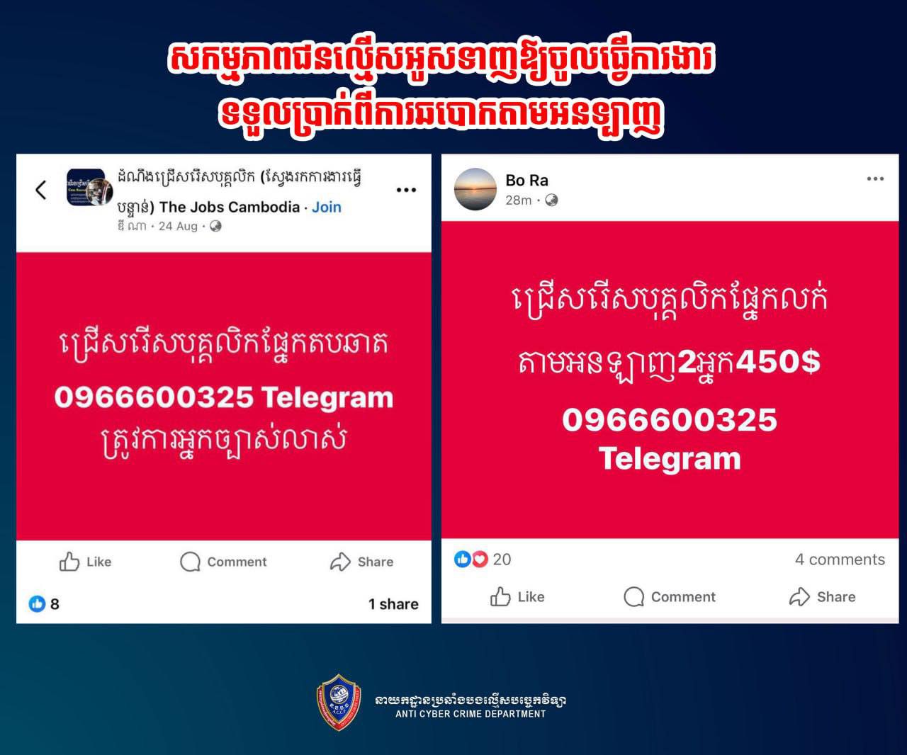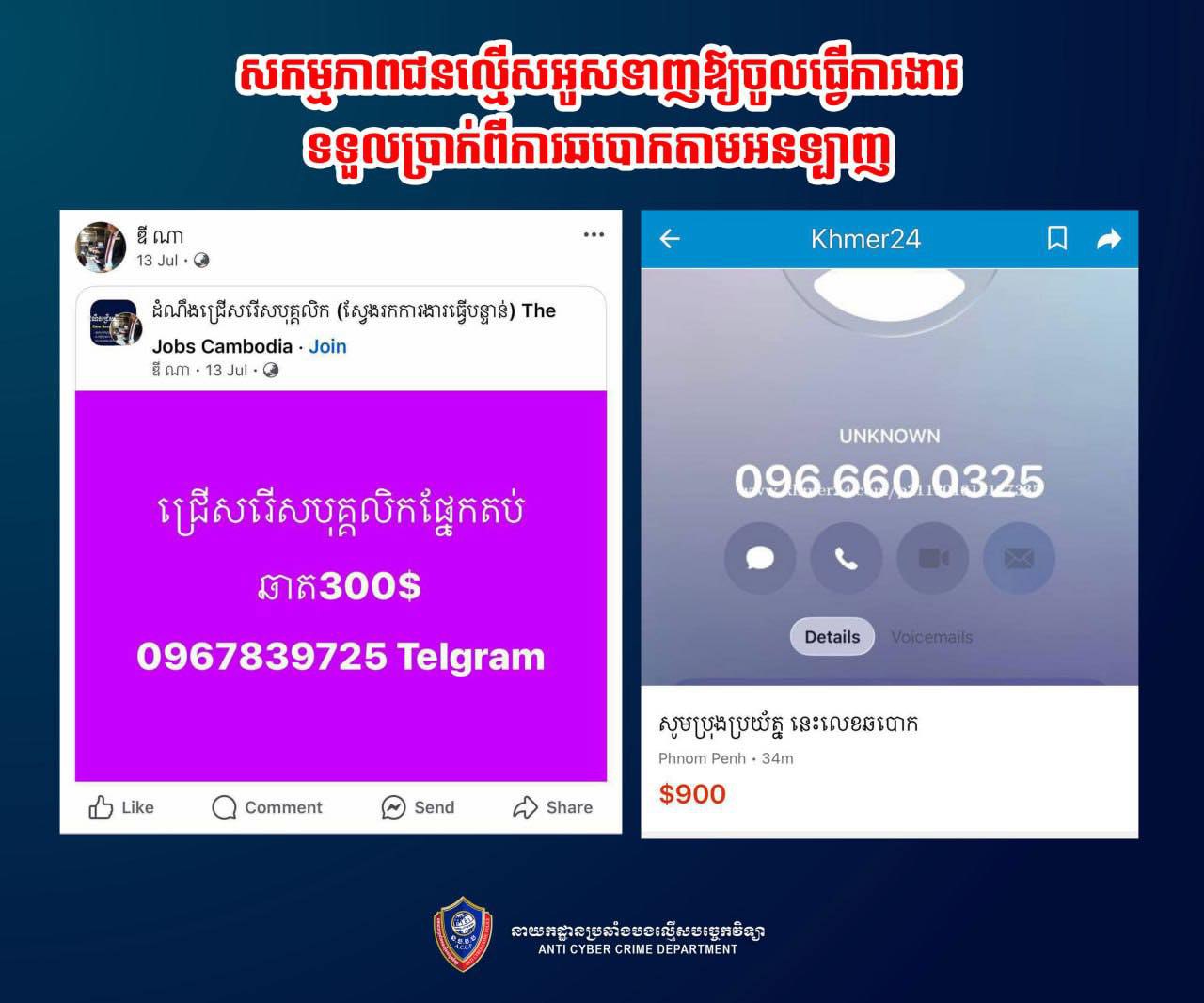 នាយកដ្ឋាន សូមក្រើនរំលឹកដល់សារធារណជន សូមប្រុងប្រយ័ត្នខ្ពស់ ពីការផ្ដល់ឱកាសការងារតាមអនឡាញដែលមិនស្គាល់ប្រភពច្បាស់លាស់ អាចត្រូវបានជនអនាមិកបញ្ចុះបញ្ចូល អូសទាញ រហូតក្លាយជាអ្នកទទួលផលនៃបទល្មើសផ្សេងៗ និងត្រូវទទួលទោសតាមផ្លូវច្បាប់ជាធរមាន៕