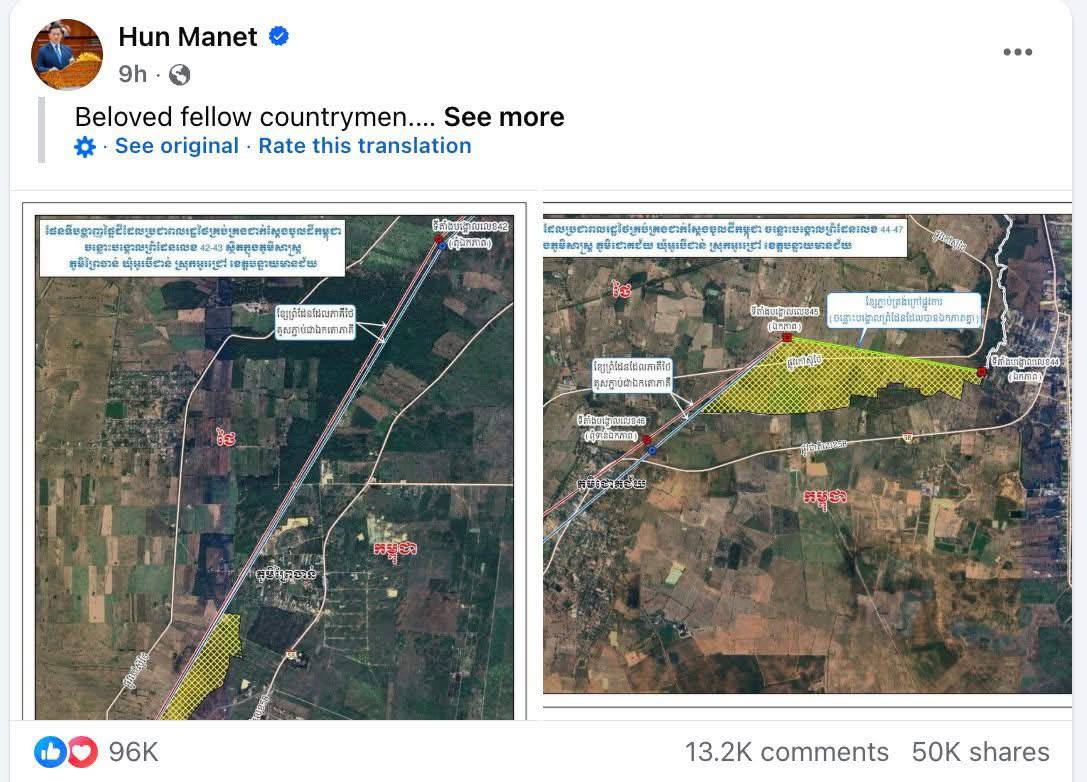 សូមជម្រាបថា យោងតាមសំណេរដែលបានបង្ហោះលើបណ្ដាញសង្គមផ្លូវការរបស់ សម្ដេច ហ៊ុន ម៉ាណែត នាយករដ្ឋមន្រ្តីកម្ពុជា បានបញ្ជាក់ថា នៅក្នុងកិច្ចប្រជុំ JBC រយៈពេលពីរថ្ងៃពេញ (២១-២២ តុលា) ដែលទើបបញ្ចប់នៅរំលងអាធ្រាតចូលថ្ងៃ ២៣ តុលា ២០២៥ ភាគីកម្ពុជា-ថៃ បានពិភាក្សាគ្នាយ៉ាងល្អិតល្អន់ ពាក់ព័ន្ធនឹងការស្វែងរកដំណោះស្រាយដោយតម្លាភាព និងត្រឹមត្រូវតាមគោលការណ៍ដែលបានឯកភាពគ្នា ក្នុងបំណងឈានទៅដោះស្រាយបញ្ចប់ជម្លោះនៅក្នុងភូមិជោគជ័យ និងភូមិព្រៃចាន់ (ចន្លោះបង្គោលព្រំដែនលេខ ៤២ និង ៤៧) ។