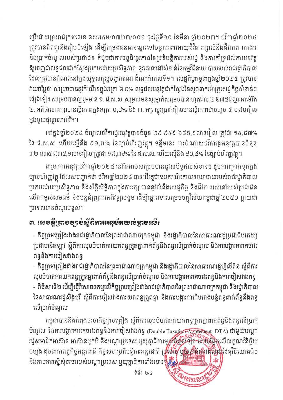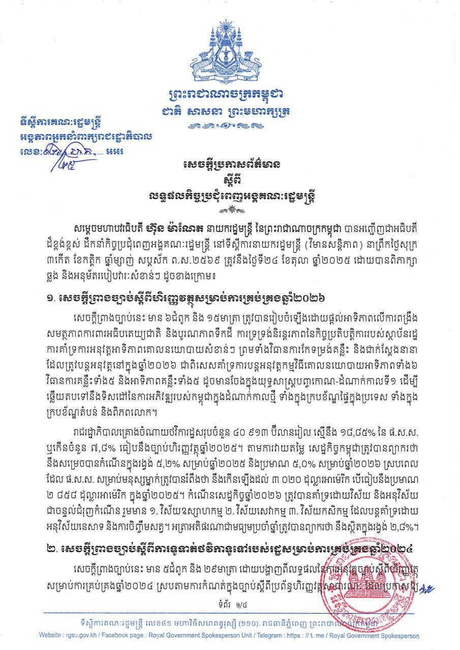ភ្នំពេញ៖ គណៈរដ្ឋមន្ត្រីអនុម័តសេចក្តីព្រាងច្បាប់ ស្តីពី ការអនុម័តយល់ព្រមលើ កិច្ចព្រមព្រៀងរវាងរាជរដ្ឋាភិបាលកម្ពុជា និងរដ្ឋាភិបាលប្រជាមានិតឡាវ ព្រមទាំងជាមួយរដ្ឋាភិបាលហ្វីលីពីន ស្តីពី «ការលុបបំបាត់ការយកពន្ធត្រួតគ្នាពាក់ព័ន្ធនឹងពន្ធលើប្រាក់ចំណូល និងការបង្ការការគេចវេះពន្ធ និងការចៀសវាងពន្ធ» បានឆ្លុះបញ្ចាំងអំពីគោលការណ៍សំខាន់ៗ នៃគោលនយោបាយពន្ធដារអន្តរជាតិ និងច្បាប់ និងបទប្បញ្ញត្តិ ស្តីពី ពន្ធដាររបស់កម្ពុជា ក៏ដូចជាតាមលំនាំគំរូ អង្គការសហប្រជាជាតិ។ នេះបើយោងតាមសេចក្តីប្រកាសព័ត៌មាន ស្តីពី លទ្ធផលនៃកិច្ចប្រជុំពេញអង្គគណៈរដ្ឋមន្ត្រី ក្រោមអធិបតីភាព សម្តេចធិបតី ហ៊ុន ម៉ាណែត នាយករដ្ឋមន្ត្រី នៅព្រឹកថ្ងៃសុក្រ ទី២៤ ខែតុលានេះ។