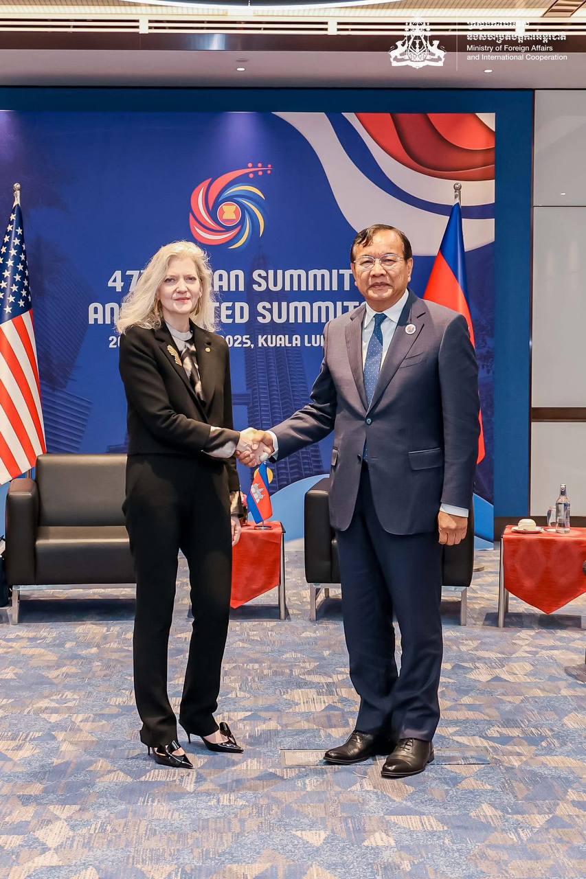 គូឡាឡាំពួរ៖ ក្នុងជំនួបទ្វេភាគីកំឡុងពេលចូលកិច្ចប្រជុំកំពូលអាស៊ាន នៅទីក្រុងគូឡាឡាំពួរ ប្រទេសម៉ាឡេស៊ី កឧបនាយករដ្ឋមន្ត្រី ប្រាក់ សុខុន រដ្ឋមន្ត្រីក្រសួងការបរទេស និងសហប្រតិបត្តិការអន្តរជាតិ បានគូសបញ្ជាក់សារជាថ្មី ជម្រាបប្រាប់លោកស្រី Allison Hooker អនុរដ្ឋលេខាធិការ ទទួលបន្ទុកនយោបាយ នៃក្រសួងការបរទេសសហរដ្ឋអាម៉េរិក ថា «កម្ពុជា នឹងបន្តការពង្រឹង និងធ្វើឲ្យកាន់តែស៊ីជម្រៅបន្ថែមទៀត នៃទំនាក់ទំនង និងភាពជាដៃគូរវាងប្រទេសទាំងពីរ»។