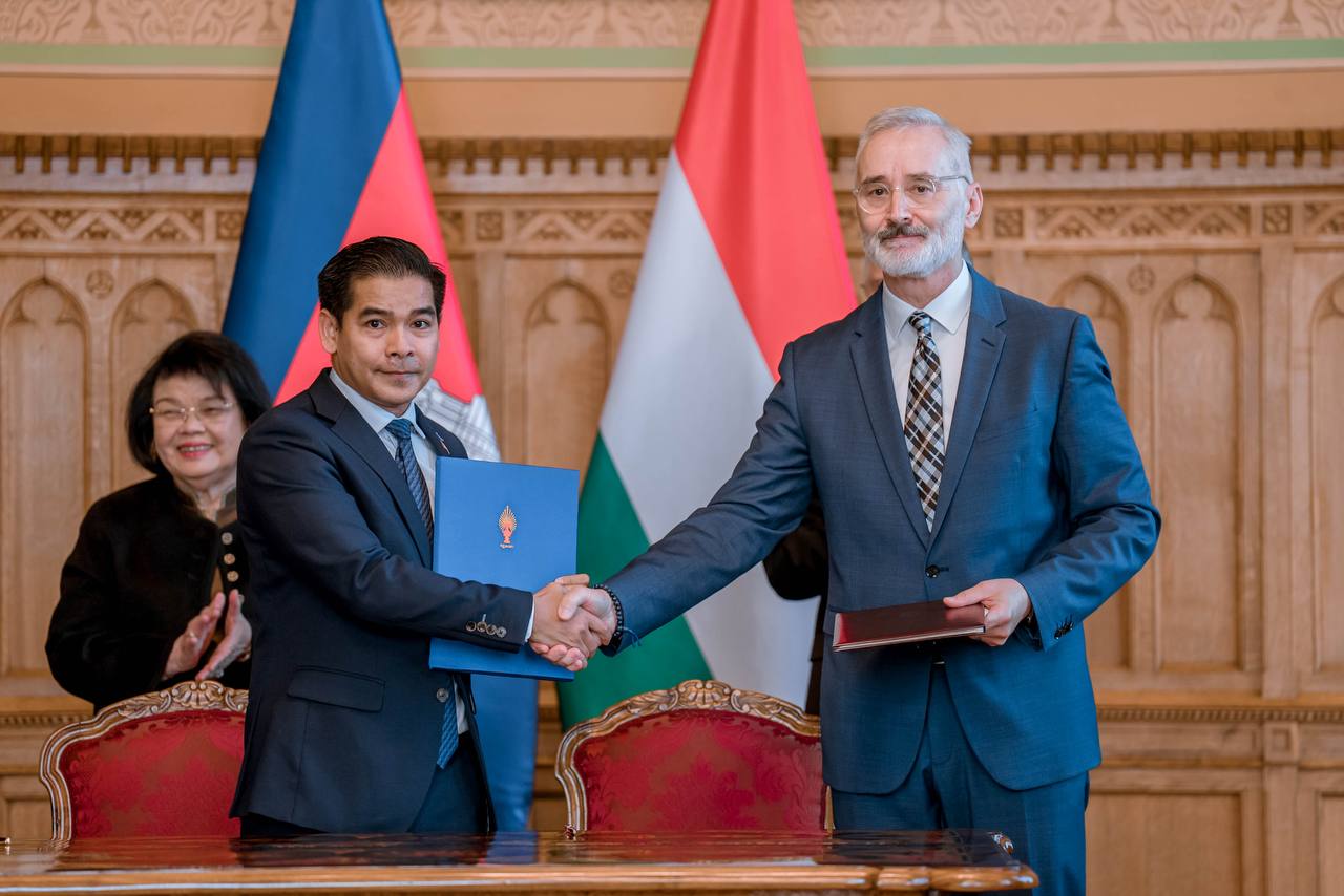 ហុងគ្រី៖ បន្ទាប់ពីជំនួបពិភាក្សារងារទ្វេភាគី រវាងសម្តេចរដ្ឋសភាធិការធិបតី ឃួន សុដារី ប្រធានរដ្ឋសភានៃព្រះរាជាណាចក្រកម្ពុជា និងលោក ឡាស្លូ កូវឺរ (László Kövér) ប្រធានរដ្ឋសភាហុងគ្រី នៅព្រឹកថ្ងៃទី២៧ ខែតុលា ឆ្នាំ២០២៥នេះ រួចមក ថ្នាក់ដឹកនាំរដ្ឋសភាប្រទេសទំាងពីរបានចុះហត្ថលេខាលើអនុស្សរណៈនៃការយោគយល់គ្នា និងបានអញ្ជើញធ្វើជាអធិបតីភាព ក្នុងការចុះហត្ថលេខាលើអនុស្សរណៈ នៃការយោគយល់គ្នា រវាងអគ្គលេខាធិការដ្ឋានរដ្ឋសភាប្រទេសទំាងពីរ ផងដែរ។