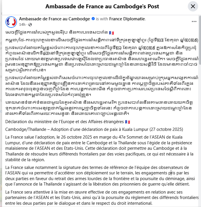 យោងតាមសេចក្តីថ្លែងការណ៍របស់ ក្រសួងអឺរ៉ុប និងការបរទេសបារាំង នៅថ្ងៃទី២៧ ខែតុលា ឆ្នាំ២០២៥ នេះ បានបញ្ជាក់ថា «កម្ពុជា-ថៃ បានចុះហត្ថលេខាលើសេចក្តីថ្លែងការណ៍សន្តិភាព នៅទីក្រុងគូឡាឡាំពួរ ប្រទេសម៉ាឡេស៊ី»។