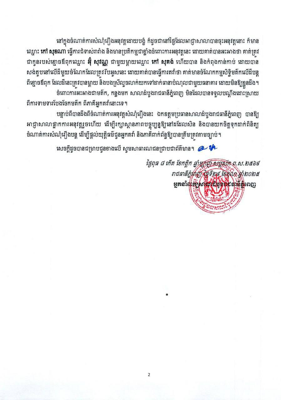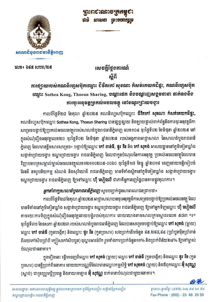 អ្នកនាំពាក្យសាលាដំបូងរាជធានីភ្នំពេញ សូមបញ្ជាក់ថា៖ កាលពីថ្ងៃទី២៨ ខែតុលា ឆ្នាំ២០២៥ អាជ្ញាសាលាបានចុះអនុវត្តដីកាសម្រេច “បង្គាប់ឱ្យប្រគល់អចលនវត្ថុ” ដែលមានទីតាំងនៅភូមិគៀនឃ្លាំង សង្កាត់ជ្រោយចង្វារ ខណ្ឌជ្រោយចង្វារ រាជធានីភ្នំពេញ ឱ្យទៅអ្នកទិញឈ្មោះ ហ៊ី សៀងលី តាមរយៈការទិញក្នុងសំណុំរឿងអនុវត្តដោយបង្ខំរបស់តុលាការ ដោយយោងតាមសាលក្រមស្ថាពរលេខ ៥៨៣ «រ» ចុះថ្ងៃទី៣១ ខែឧសភា ឆ្នាំ២០២៣ របស់សាលាដំបូងរាជធានីភ្នំពេញ ដែលបានសម្រេចបង្គាប់ឱ្យឈ្មោះ កៅ សុគង់ (ម្តាយ) ឈ្មោះ កៅ ចាន់ធី (កូនបង្កើត) និងឈ្មោះ ជួរ រីន (កូនប្រសារ) សងប្រាក់ដើមចំនួន ៩៥.២៩៨,៩៤ (ប្រាំបួនម៉ឺនប្រាំពាន់ ពីររយកៅសិបប្រាំបី ក្បៀសកៅសិបបួន) ដុល្លារអាម៉េរិក រួមទាំងការប្រាក់ចំនួន១១% និងប្រាក់ពិន័យ២៤% ឱ្យទៅម្ចាស់ បំណុលជាធនាគារ។