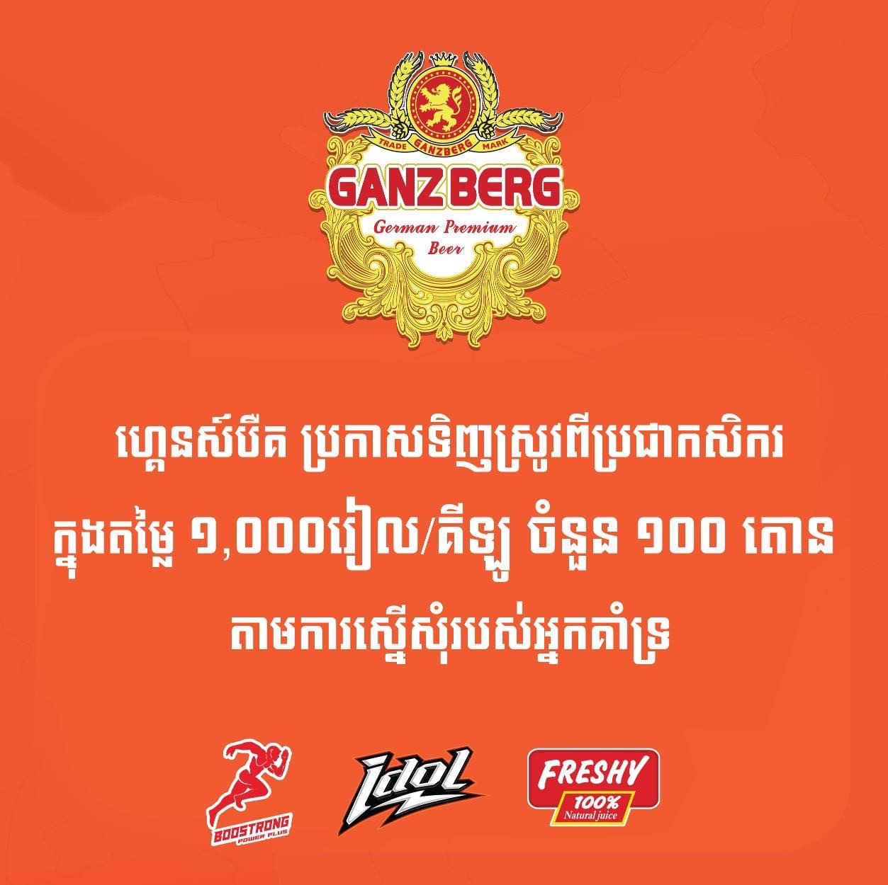 ៤.ក្រុមហ៊ុន GANZBERG ប្រកាសទិញស្រូវពីប្រជាកសិករក្នុងតម្លៃ ១,០០០ រៀល ក្នុង ១ គីឡូ ចំនួន ១០០ តោន តាមការស្នើសុំរបស់អ្នកគាំទ្រ។