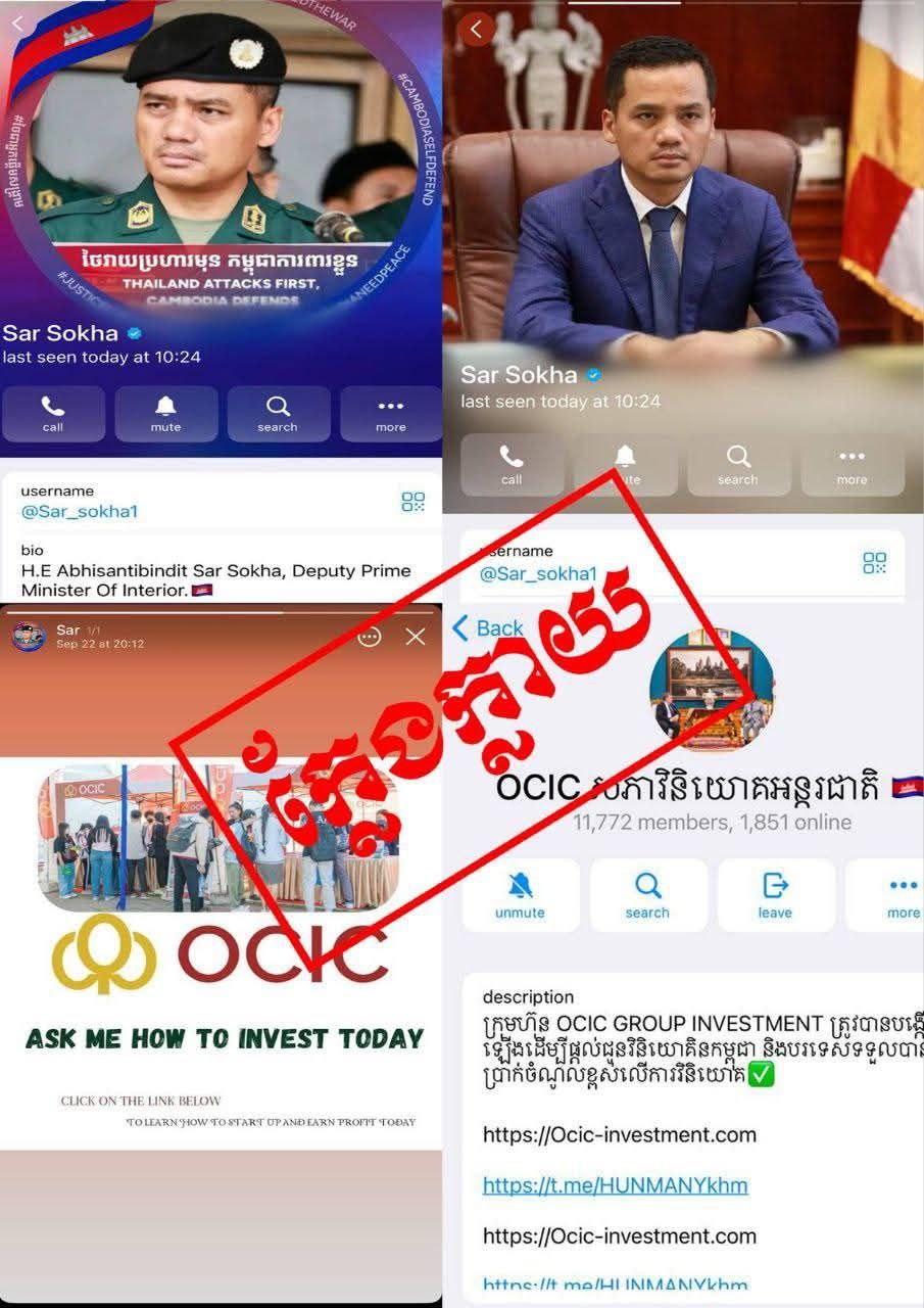 ភ្នំពេញ៖ លោក រ៉េន រតនៈ អ្នកនាំពាក្យ អភិសន្តិបណ្ឌិត ស សុខា ឧបនាយករដ្ឋមន្ត្រី រដ្ឋមន្ត្រីក្រសួងមហាផ្ទៃ នៅថ្ងៃទី០៣ ខែវិច្ឆិកា ឆ្នាំ២០២៥នេះ បានចេញសេចក្ដីបញ្ជាក់ព័ត៌មានជូនសាធារណជនជ្រាបថា នៅក្នុងបណ្ដាញទំនាក់ទំនងសង្គមតេឡេក្រាម មានជនខិលខូចបានបង្កើតគណនីដោយបន្លំប្រើឈ្មោះ អភិសន្តិបណ្ឌិតជាអក្សរអង់គ្លេសថា «Sar Sokha» និងថែមទាំងដាក់រូបភាពរបស់លោកទៀតផង។