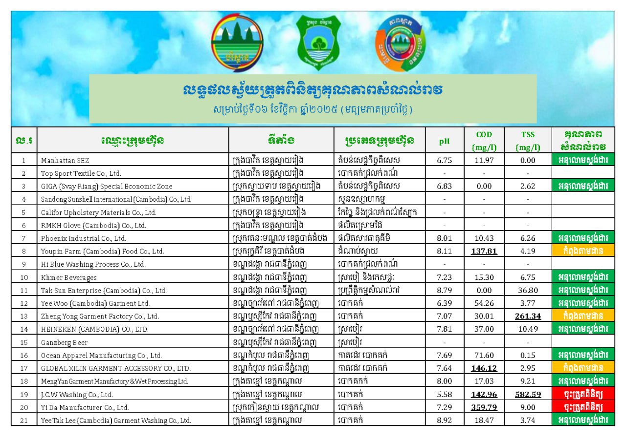 សូមបញ្ជាក់ថា គិតត្រឹមខែតុលា ឆ្នាំ២០២៥នេះដែរ រោងចក្រ សហគ្រាស និងក្រុមហ៊ុន ចំនួន ៦១ ទីតាំង បានចុះកិច្ចសន្យា ក្នុងនោះមាន ៤៨ ទីតាំង បានបំពាក់ឧបករណ៍ស្វ័យត្រួតពិនិត្យ និងប្រព័ន្ធគ្រប់គ្រងទិន្នន័យការបញ្ចេញសំណល់រាវ នៅតាមទីតាំងរៀងៗខ្លួន៕