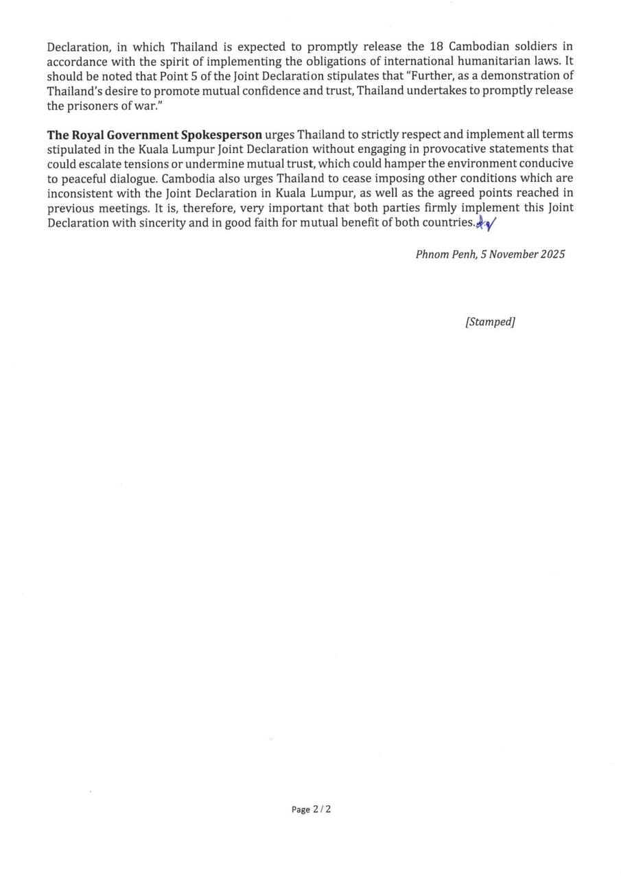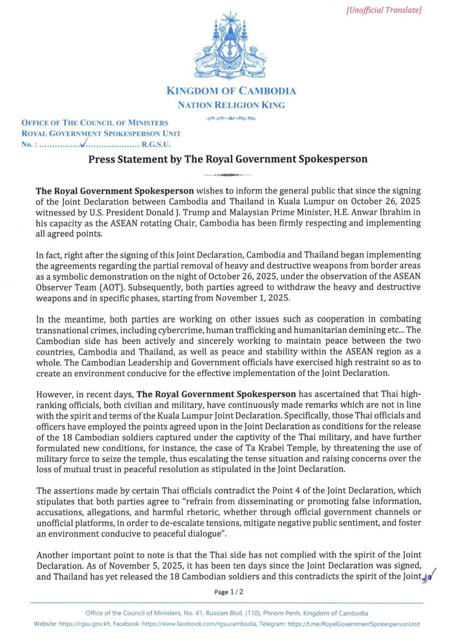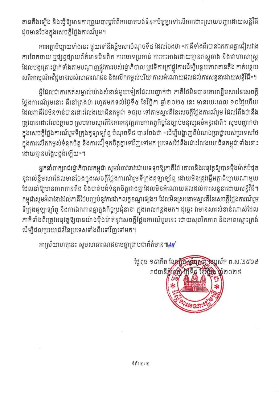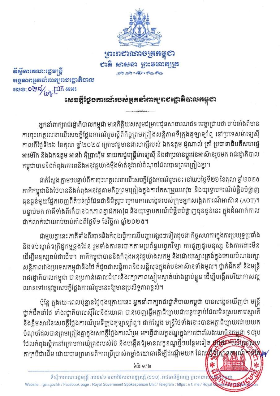 អ្នកនាំពាក្យរាជរដ្ឋាភិបាលកម្ពុជា មានកិត្តិយសសូមជម្រាបជូនសាធារណជន មេត្តាជ្រាបថា ចាប់តាំងពីមាន ការចុះហត្ថលេខាលើសេចក្តីថ្លែងការណ៍រួមស្តីពីកិច្ចព្រមព្រៀងសន្តិភាពទីក្រុងគូឡាឡាំពួ នៅប្រទេសម៉ាឡេស៊ី កាលពីថ្ងៃទី២៦ ខែតុលា ឆ្នាំ២០២៥ ក្រោមវត្តមានជាសាក្សីរបស់ ឯកឧត្តម ដូណាល់ ត្រាំ ប្រធានាធិបតីសហរដ្ឋ អាម៉េរិក និងឯកឧត្តម អានវ៉ា អ៊ីប្រាហ៊ីម នាយករដ្ឋមន្ត្រីម៉ាឡេស៊ី និងជាប្រធានប្តូរវេនអាស៊ានរួចមក រាជរដ្ឋាភិបាល កម្ពុជាបាននិងកំពុងគោរពនិងអនុវត្តយ៉ាងម៉ឺងម៉ាត់នូវរាល់ចំណុចដែលបានព្រមព្រៀងគ្នា។