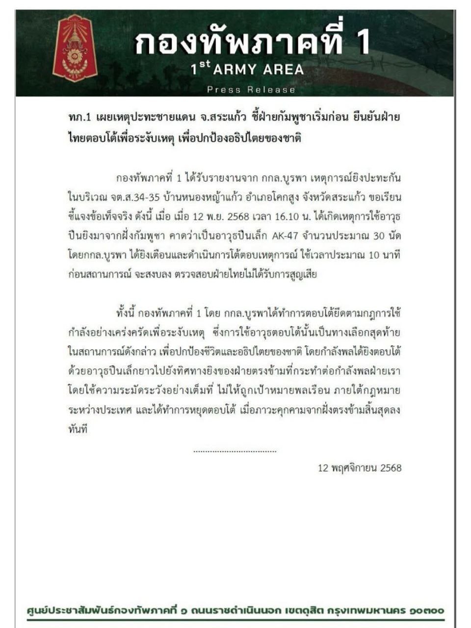 នៅថ្ងៃទី១២ ខែវិច្ឆិកា ឆ្នាំ២០២៥ យោធភូមិភាគទី១ ថៃ បានចេញមកធ្វើការបំភ្លឺពីឧប្បត្តិហេតុនៅតំបន់ព្រំដែន ដែលជាការបំភ្លៃការពិតទាំងស្រុងដោយចោទកម្ពុជាថា នាវេលាម៉ោង១៦និង១០នាទី ថ្ងៃខែឆ្នាំដដែល មានការបាញ់ប្រហារមួយកើតឡើងពីភាគីកម្ពុជា ដែលសន្មតថាជាអាវុធធុនតូច (AK-47) សរុបប្រមាណជា៣០គ្រាប់។