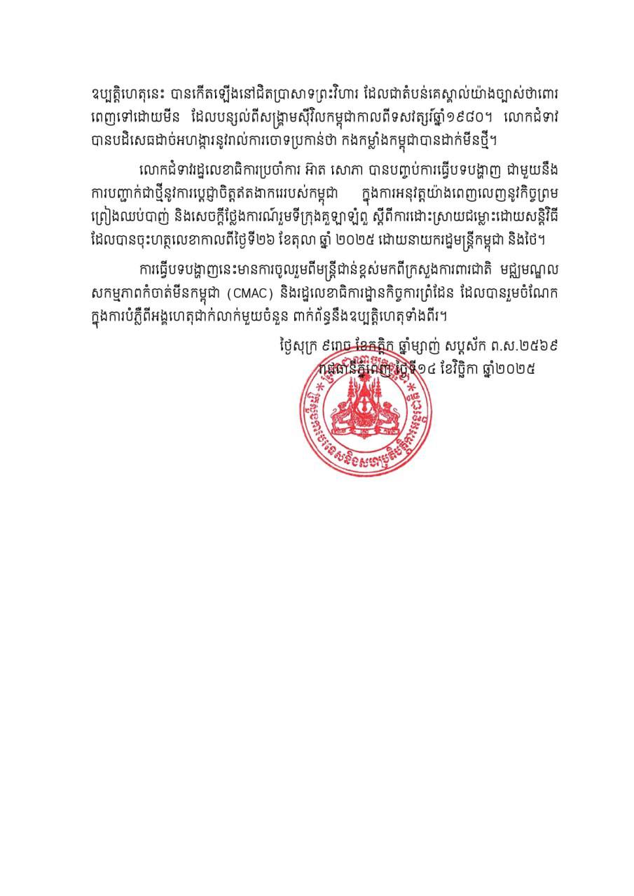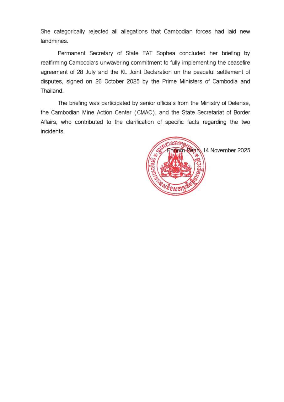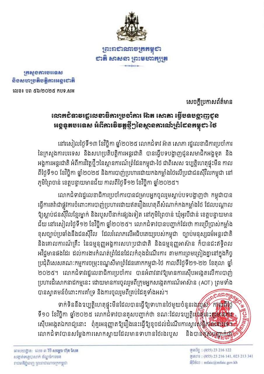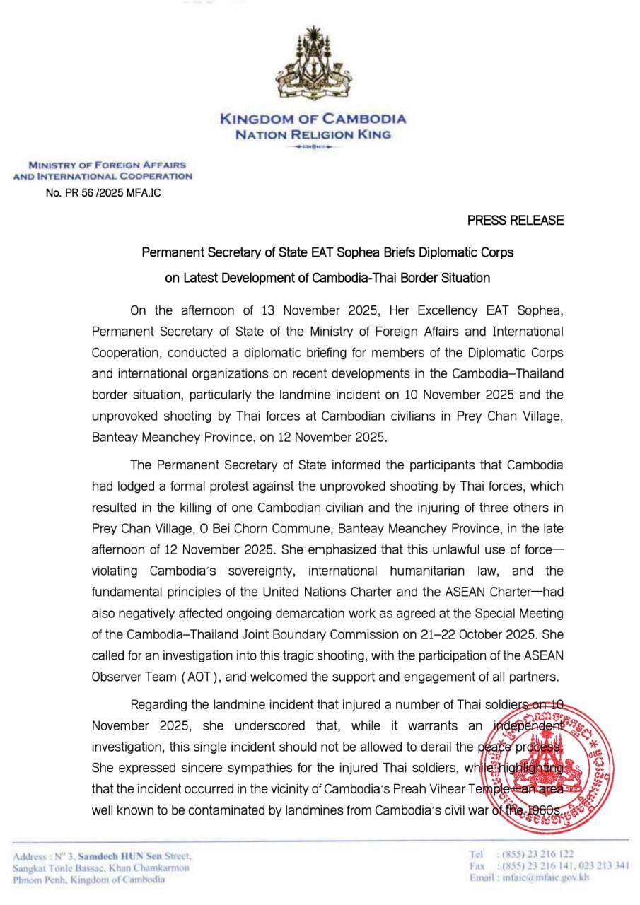 ក្រសួងបានប្រកាសថា នៅរសៀលថ្ងៃទី១៣ ខែវិច្ឆិកា ឆ្នាំ២០២៥ លោកស្រី អ៊ាត សោភា រដ្ឋលេខាធិការប្រចាំការ នៃក្រសួងការបរទេស និងសហប្រតិបត្តិការអន្តរជាតិ បានធ្វើបទបង្ហាញជូនសមាជិកអង្គទូត និងអង្គការអន្តរជាតិ អំពីការវិវត្តថ្មីៗនៃស្ថានការណ៍ព្រំដែន កម្ពុជា-ថៃ ជាពិសេស ឧប្បត្តិហេតុផ្ទុះមីន កាលពីថ្ងៃទី១០ ខែវិច្ឆិកា ឆ្នាំ២០២៥ និងការបាញ់ប្រហារដោយកងកម្លាំងថៃ លើប្រជាជនស៊ីវិលកម្ពុជា នៅភូមិព្រៃចាន់ ខេត្តបន្ទាយមានជ័យ កាលពីថ្ងៃទី១២ ខែវិច្ឆិកា ឆ្នាំ២០២៥។