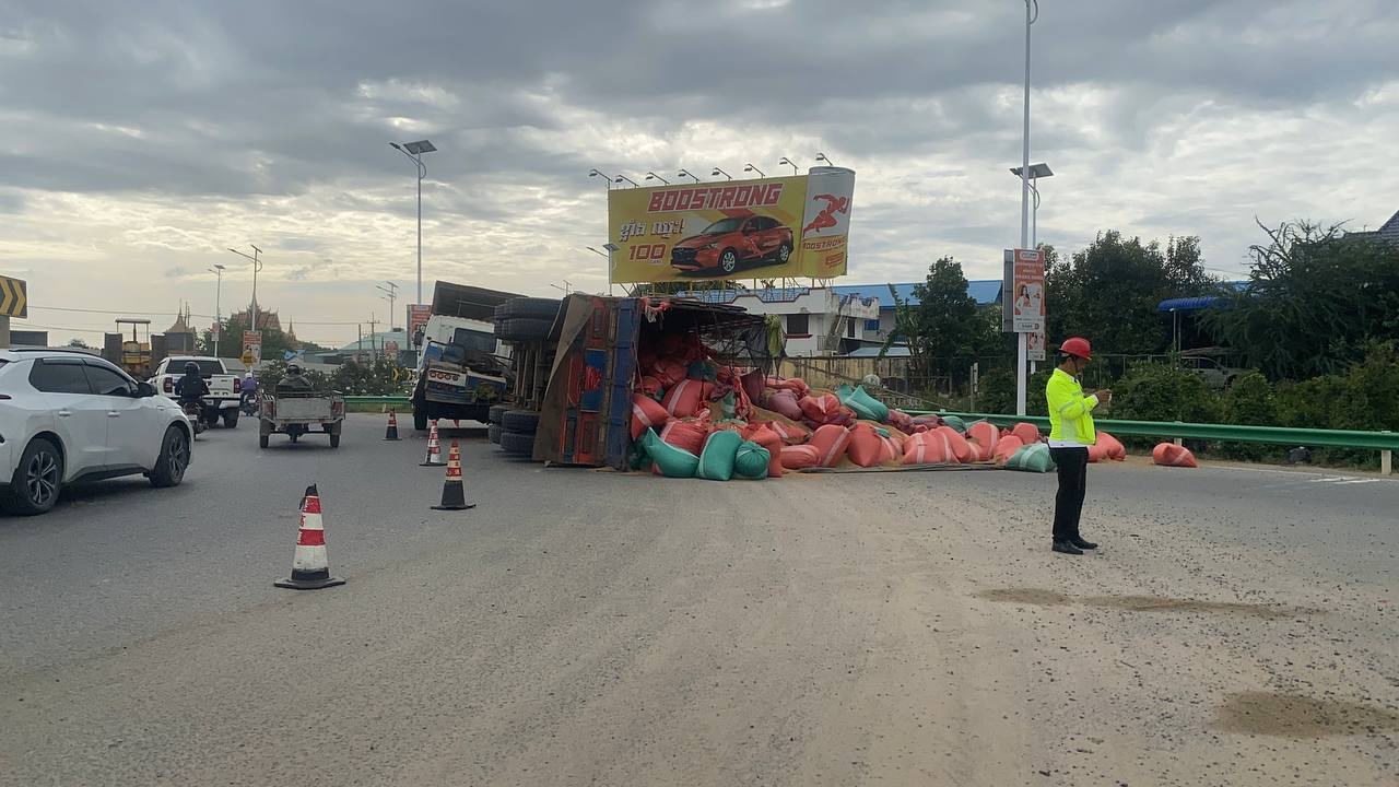 ភ្នំពេញ៖ រថយន្ដដឹកស្រូវ១គ្រឿងបានបើកលឿន ដល់ត្រង់ចំណុចរង្វង់មូលផ្លូវកោងស្រាប់រម៉កខាងក្រោយកាច់ទ្រុងក្រឡាប់ចាក់ស្រូវចោលពេញផ្លូវ ប៉ុន្តែសំណាងល្អពុំមានគ្រោះថ្នាក់ដល់អ្នកធ្វើដំណើរតាមផ្លូវនោះឡើយ ។