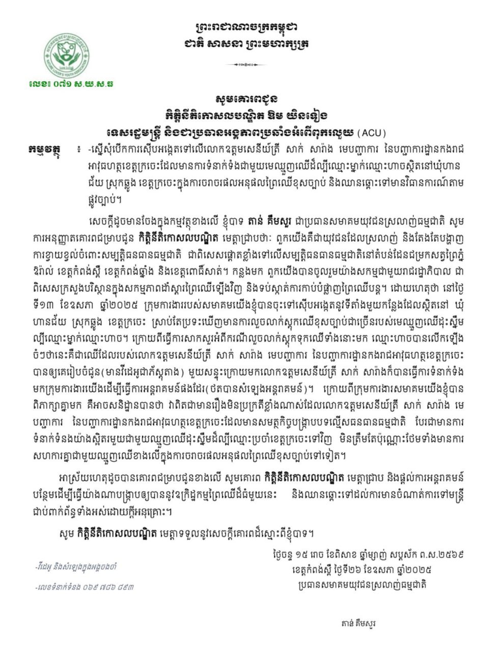 លោក តាន់ គឹមសួរ បានបញ្ជាក់លើបណ្តាញសង្គមថា “លោកបានដាក់ពាក្យបណ្ដឹងទៅកាន់អង្គភាពប្រឆាំងអំពើពុករលួយ (ACU) យូរហើយអំពីករណីអន្តរាគមន៍បទល្មើសធនធានធម្មជាតិរបស់ លោកឧត្ដមសេនីយ៍ត្រី សាក់ សារ៉ាង មេបញ្ជាការកងរាជអាវុធហត្ថខេត្តក្រចេះ ភ្ជាប់ជាមួយទាំងភ័ស្តុតាង តែអង្គភាពប្រឆាំងអំពើពុករលួយនៅមិនទាន់មានការឆ្លើយតបនៅឡើយ”។