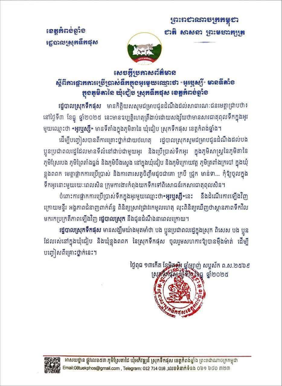 កំពង់ឆ្នាំង៖ នៅថ្ងៃទី០៣ ខែធ្នូ ឆ្នាំ២០២៥ មានឧប្បត្តិហេតុត្រីងាប់ដោយសង្ស័យថា មានសារធាតុពុលទឹកក្នុងអូរ មួយឈ្មោះថា «អូរឬស្សី» មានទីតាំង ក្នុងភូមិតានៃ ឃុំជៀប ស្រុកទឹកផុស ខេត្តកំពង់ឆ្នាំង។ ដើម្បីបញ្ចៀសបានពីការគ្រោះថ្នាក់ជាយថាហេតុ រដ្ឋបាលស្រុក បានជូនដំណឹងដល់បងប្អូនប្រជាពលរដ្ឋ ដែលមានទីលំនៅជាប់ជាមួយអូរ មេត្តាផ្អាកការប្រើប្រាស់ និងការពារសត្វចិញ្ចឹមដូចជាគោ ក្របី ជ្រូក មាន់ទា... កុំឱ្យចូលក្នុងទឹកអូរនោះមួយរយៈពេលសិន រងចាំជំនាញយកទឹកទៅពិសោធន៍រកសារធាតុពុលសិន។