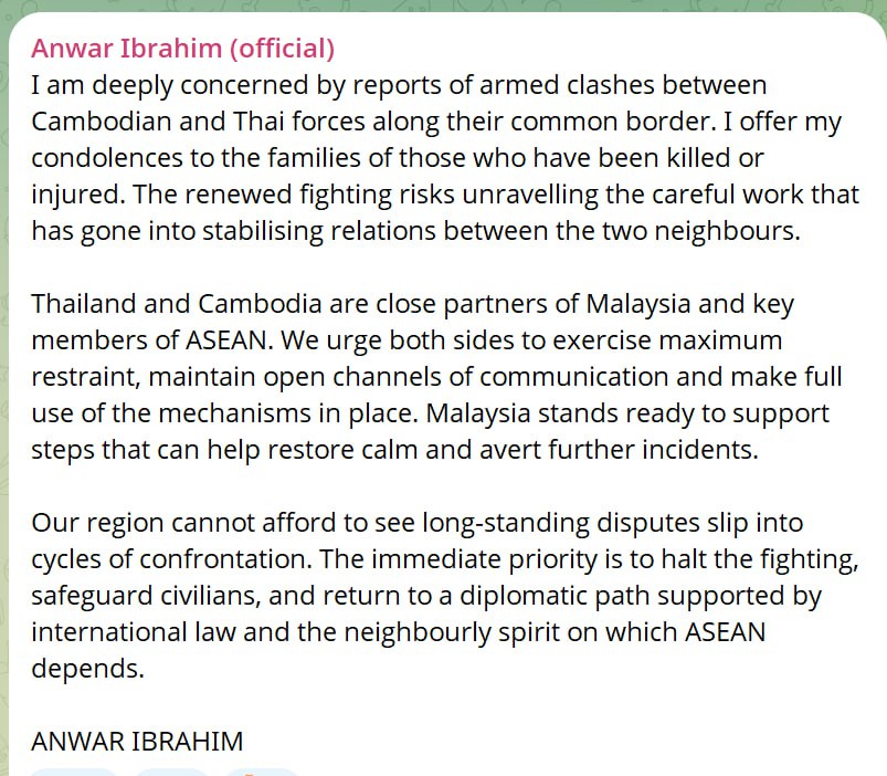 នាយករដ្ឋមន្ត្រីម៉ាឡេស៊ី លោក អាន់វ៉ា អ៊ីប្រាហ៊ីម ជាប្រធានអាស៊ាន បានបង្ហាញការព្រួយបារម្ភយ៉ាងខ្លាំងចំពោះរបាយការណ៍អំពីការប៉ះទង្គិចដោយអាវុធ រវាងកងកម្លាំងកម្ពុជា និងថៃ នៅតាមបណ្តោយព្រំដែនរួម។ នាយករដ្ឋមន្ត្រីម៉ាឡេស៊ី បានអំពាវនាវឱ្យភាគីទាំងពីរ អនុវត្តការអត់ធ្មត់ខ្ពស់បំផុត រក្សាទំនាក់ទំនងបើកចំហ និងប្រើប្រាស់យន្តការដែលមានស្រាប់ ដើម្បីទប់ស្កាត់ការរីករាលដាលនៃហេតុការណ៍ប្រយុទ្ធគ្នា។