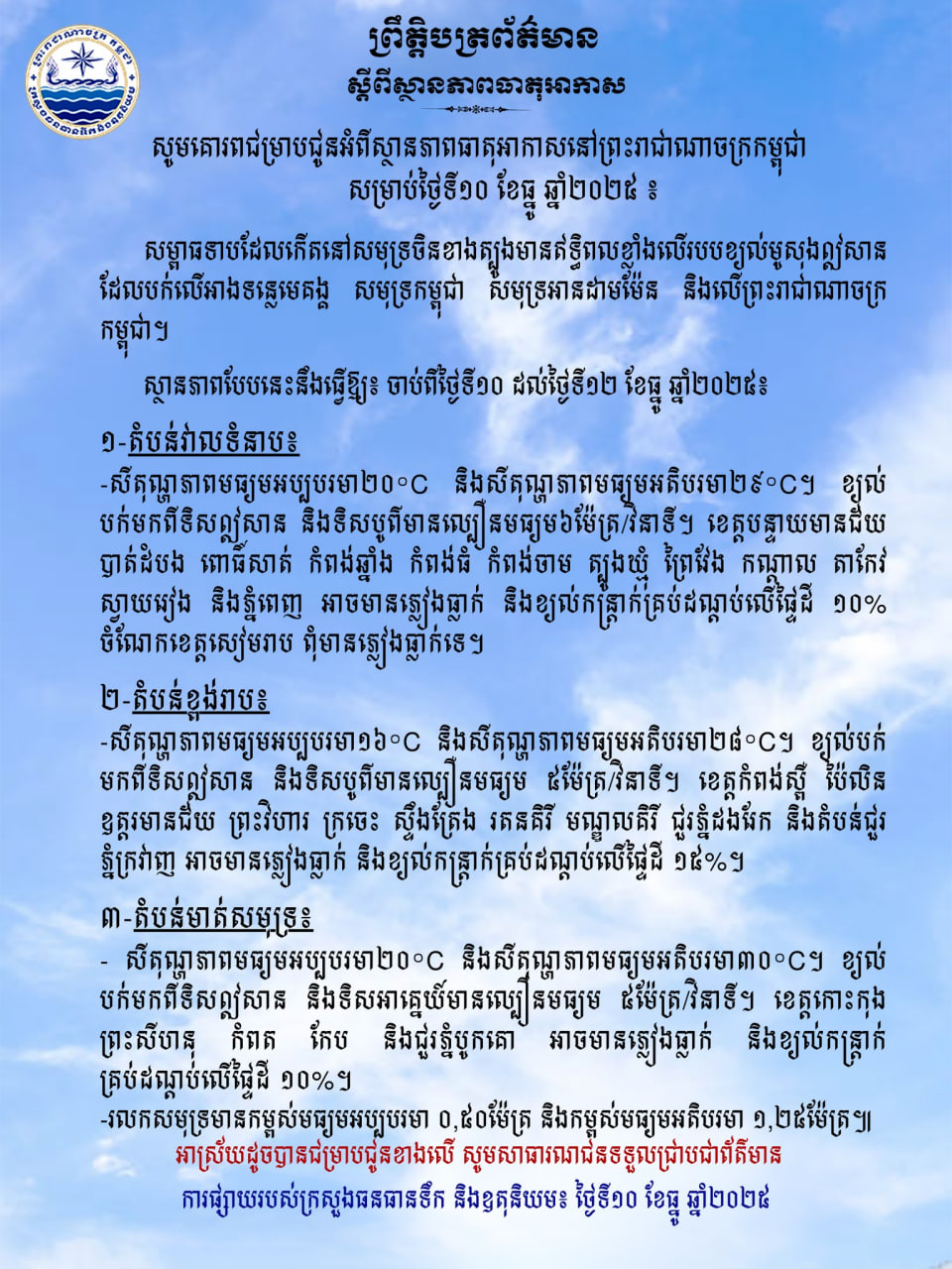 -សីតុណ្ហភាពមធ្យមអប្បបរមា២០°C និងសីតុណ្ហភាពមធ្យមអតិបរមា២៩°C។ ខ្យល់ បក់មកពីទិសឦសាន និងទិសបូព៌មានល្បឿនមធ្យម៦ម៉ែត្រ/វិនាទី។ ខេត្តបន្ទាយមានជ័យ បាត់ដំបង ពោធិ៍សាត់ កំពង់ឆ្នាំង កំពង់ធំ កំពង់ចាម ត្បូងឃ្មុំ ព្រៃវែង កណ្តាល តាកែវ ស្វាយរៀង និងភ្នំពេញ អាចមានភ្លៀងធ្លាក់ និងខ្យល់កន្ត្រាក់គ្រប់ដណ្តប់លើផ្ទៃដី ១០% ចំណែកខេត្តសៀមរាប ពុំមានភ្លៀងធ្លាក់ទេ។