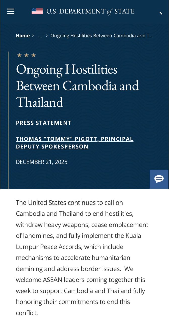 អ្នកនាំពាក្យរង ក្រសួងការបរទេសអាម៉េរិក លោក Thomas Pigott នៅថ្ងៃទី២១ ខែធ្នូ ឆ្នាំ២០២៥ បានចេញសេចក្តីថ្លែងការណ៍អំពាវនាវឱ្យកម្ពុជា និងថៃ បញ្ចប់អរិភាព ដកអាវុធធុនធ្ងន់ បញ្ឈប់ការដាក់មីន និងអនុវត្តពេញលេញនូវ «សេចក្តីប្រកាសរួមស្តីពីសន្តិភាពទីក្រុងគូឡាឡាំពួ»។
