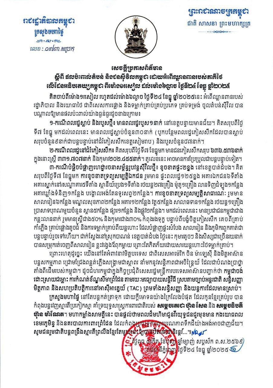 គិតចាប់ពីម៉ោង១រសៀល រហូតដល់ម៉ោង៦ល្ងាច ថ្ងៃទី២៤ ខែធ្នូ ឆ្នាំ២០២៥នេះ អំពើឈ្លានពានរបស់រដ្ឋាភិបាល និងយោធាថៃ ជាពិសេសការផ្លោង និងទម្លាក់គ្រាប់គ្រប់ប្រភេទគ្រប់ទម្រង់ ចូលតំបន់ស៊ីវិល បានបណ្តាលឱ្យមានផលប៉ះពាល់យ៉ាងធ្ងន់ធ្ងរ មានពលរដ្ឋរបួស ០១ នាក់ នៅខេត្តបន្ទាយមានជ័យ។ គិតសរុបពីថ្ងៃទី០៧ ខែធ្នូ មកដល់ពេលនេះ មានពលរដ្ឋស្លាប់ ចំនួន ៣០ នាក់ (បូកបន្ថែមពលរដ្ឋភៀសសឹកដែលបានស្លាប់ សរុបចំនួន ០៩ នាក់ ជាបន្តបន្ទាប់នៅជំរំភៀសសឹកខេត្តសៀមរាប) និងរបួសចំនួន ៨៧ នាក់។