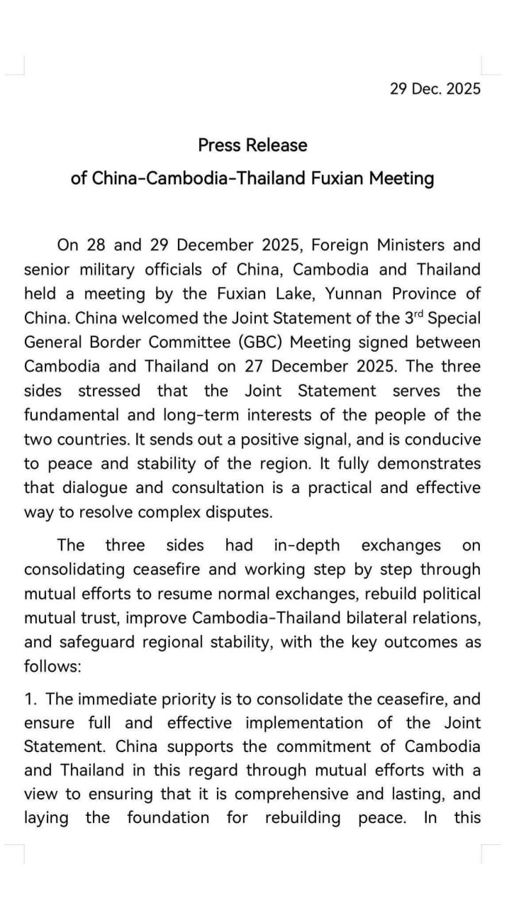 តាមសេចក្តីប្រកាសព័ត៌មានរួម ភាគីចិនបានស្វាគមន៍សេចក្តីថ្លែងការណ៍រួម នៃកិច្ចប្រជុំពិសេសលើកទី៣ នៃគណៈកម្មាធិការព្រំដែនទូទៅ (GBC) រវាងកម្ពុជា និងថៃ ដែលបានចុះហត្ថលេខានៅថ្ងៃទី២៧ ខែធ្នូ ឆ្នាំ២០២៥ ដោយចាត់ទុកថា ជាឯកសារដែលបម្រើផលប្រយោជន៍មូលដ្ឋាន និងយូរអង្វែងរបស់ប្រជាជនប្រទេសទាំងពីរ ហើយជាសញ្ញាវិជ្ជមានសម្រាប់សន្តិភាព និងស្ថិរភាពក្នុងតំបន់។