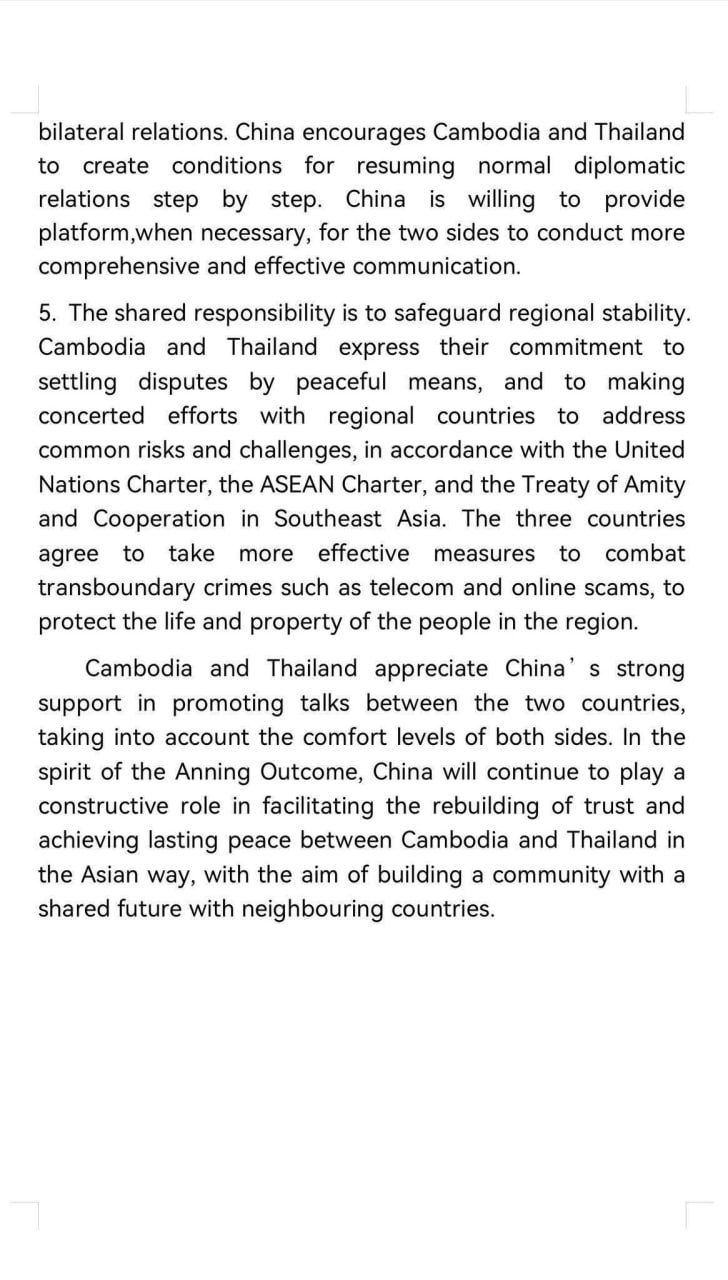 កម្ពុជា និងថៃ បានថ្លែងអំណរគុណចំពោះប្រទេសចិន ចំពោះតួនាទីសកម្ម និងស្ថាបនា ក្នុងការជំរុញការសន្ទនា និងការកសាងទំនុកចិត្តឡើងវិញ ដោយចិនបានបញ្ជាក់ថា នឹងបន្តដើរតួនាទីវិជ្ជមាន តាមវិធីសាស្ត្រអាស៊ី ដើម្បីជួយឱ្យកម្ពុជា និងថៃ សម្រេចបានសន្តិភាពយូរអង្វែង និងរួមចំណែកដល់ការកសាងសហគមន៍វាសនារួមជាមួយប្រទេសជិតខាង៕