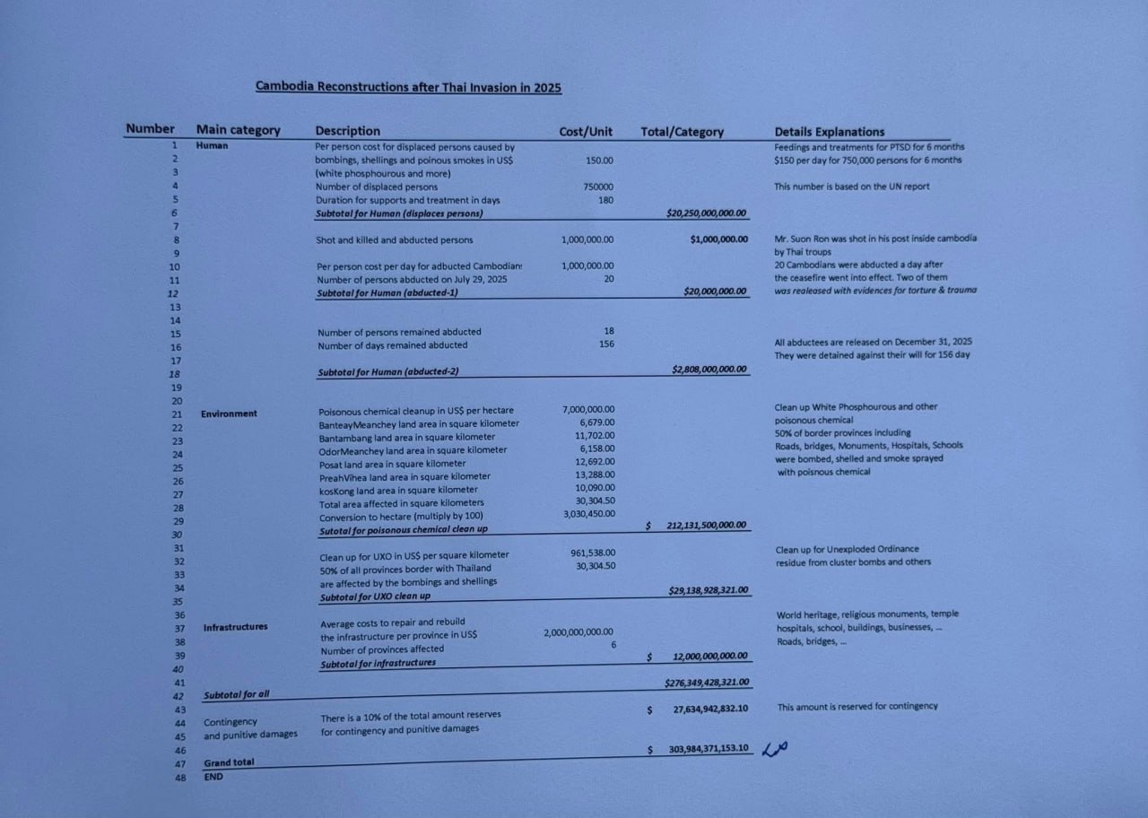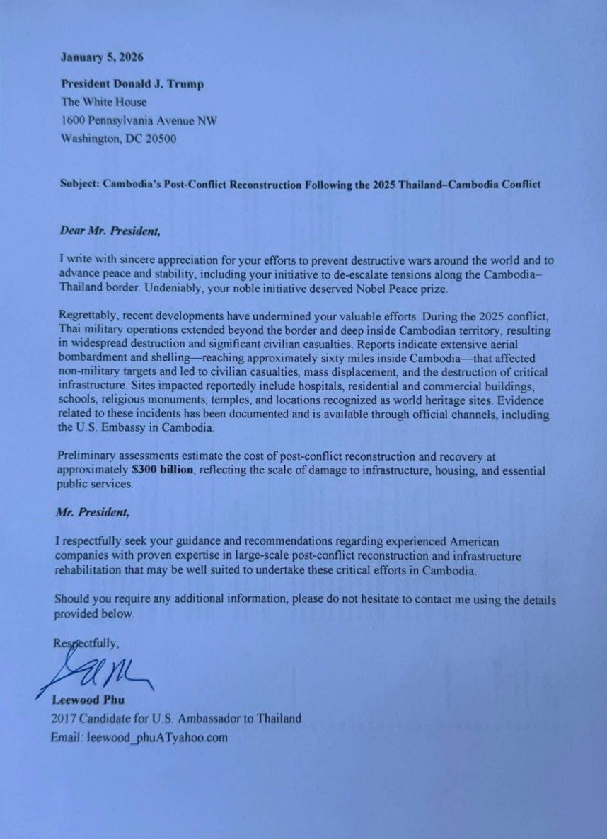 លោក ភូ លីវុឌ្ឍ (Phu Leewood) ជនជាតិខ្មែរ និងជាបុគ្គលដែលធ្លាប់ឈរឈ្មោះជាបេក្ខជនឯកអគ្គរដ្ឋទូតសហរដ្ឋអាមេរិកប្រចាំប្រទេសថៃ ក្នុងអំឡុងឆ្នាំ២០១៧ បានបង្ហោះសារលើបណ្ដាញសង្គមហ្វេសប៊ុកផ្លូបការ របស់លោក ដោយអះអាងថា «សង្គ្រាមឈ្លានពានឆ្នាំ២០២៥ បានបញ្ចប់ហើយ នៅឡើយតែសំណងខូចខាត និងការកំណត់ព្រំដែនស្របច្បាប់។ តួលេខបឋម គឺ ៣០០ ពាន់លានដុល្លារ»។
