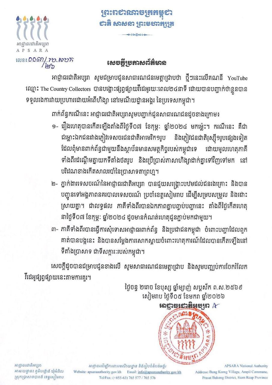 ថ្មីៗនេះ គណនី YouTube ឈ្មោះ «The Country Collectors» បានបង្ហោះវីដេអូប្រមាណ ២៤ នាទី ដោយមានការបញ្ជាក់ថា “ខ្លួនបានទទួលរងការវាយប្រហារដោយអំពើហិង្សា នៅរមណីយដ្ឋានអង្គរ ប្រទេសកម្ពុជា”។