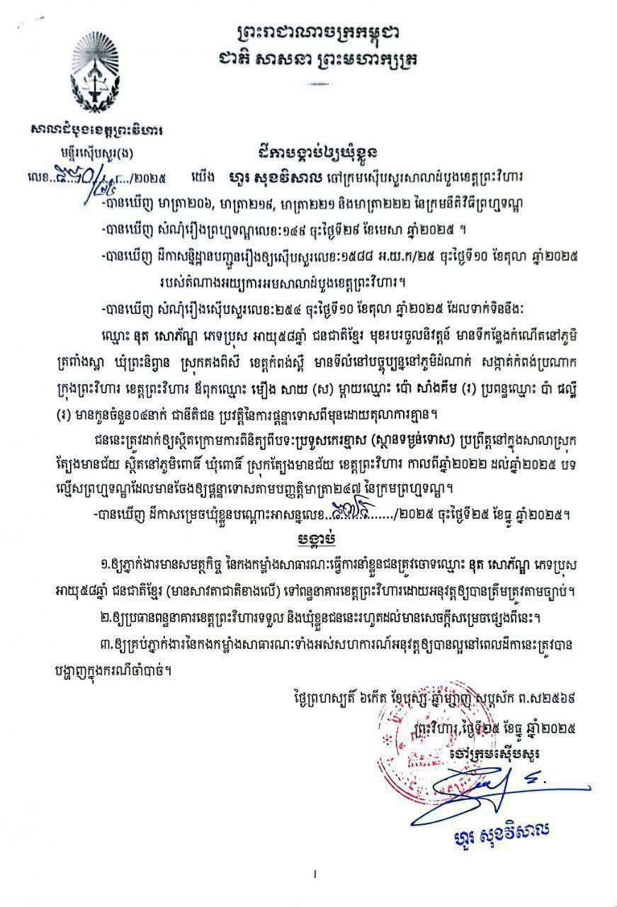 ទីបំផុត អតីតអភិបាលស្រុកត្បែងមានជ័យ ខេត្តព្រះវិហារ លោក នុត សោភ័ណ្ឌ ត្រូវបានសាលាដំបូងខេត្តព្រះវិហារ សម្រេចឃុំខ្លួនជាបណ្តោះអាសន្នក្នុងពន្ធនាគារ ពាក់ព័ន្ធសំណុំរឿងព្រហ្មទណ្ឌប្រព្រឹត្តបទល្មើស៖ «ប្រទូសកេរខ្មាស់» លើកូនចៅក្នុងអំឡុងពេលកាន់អំណាច។