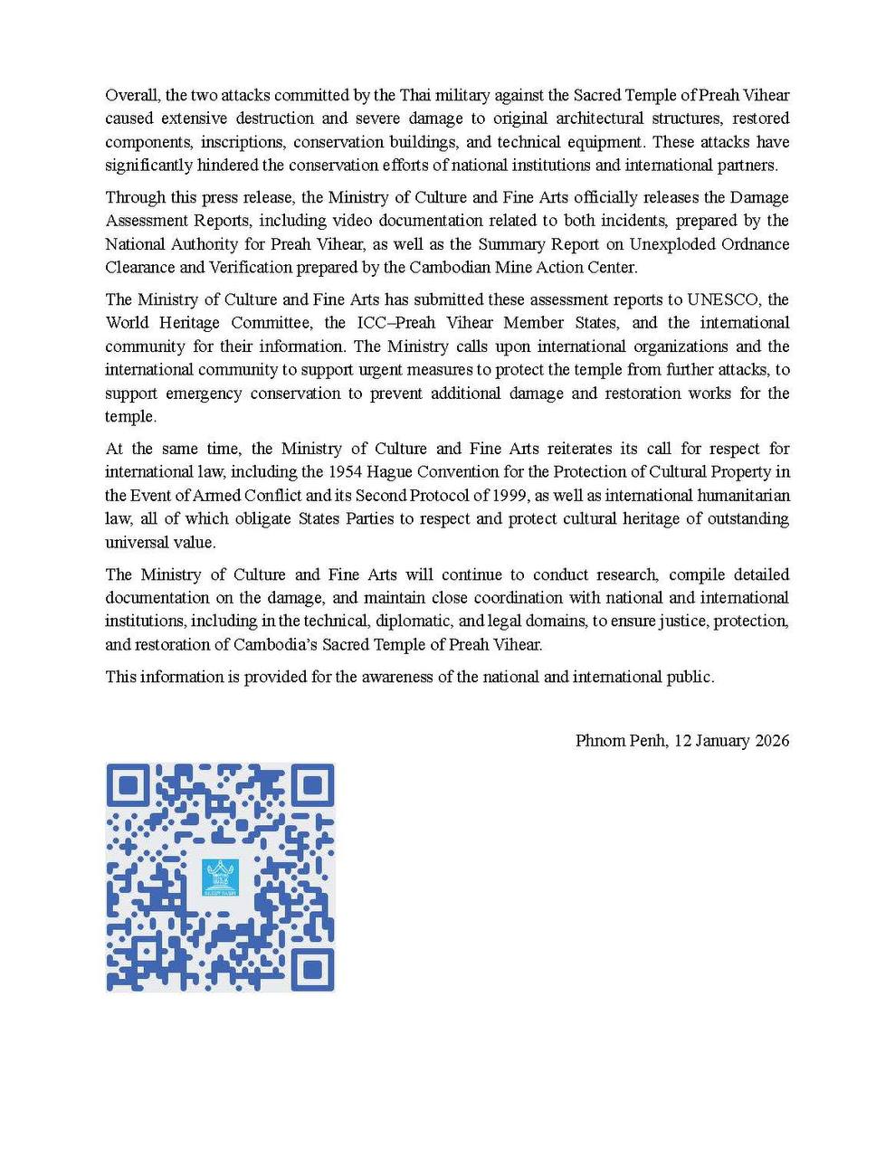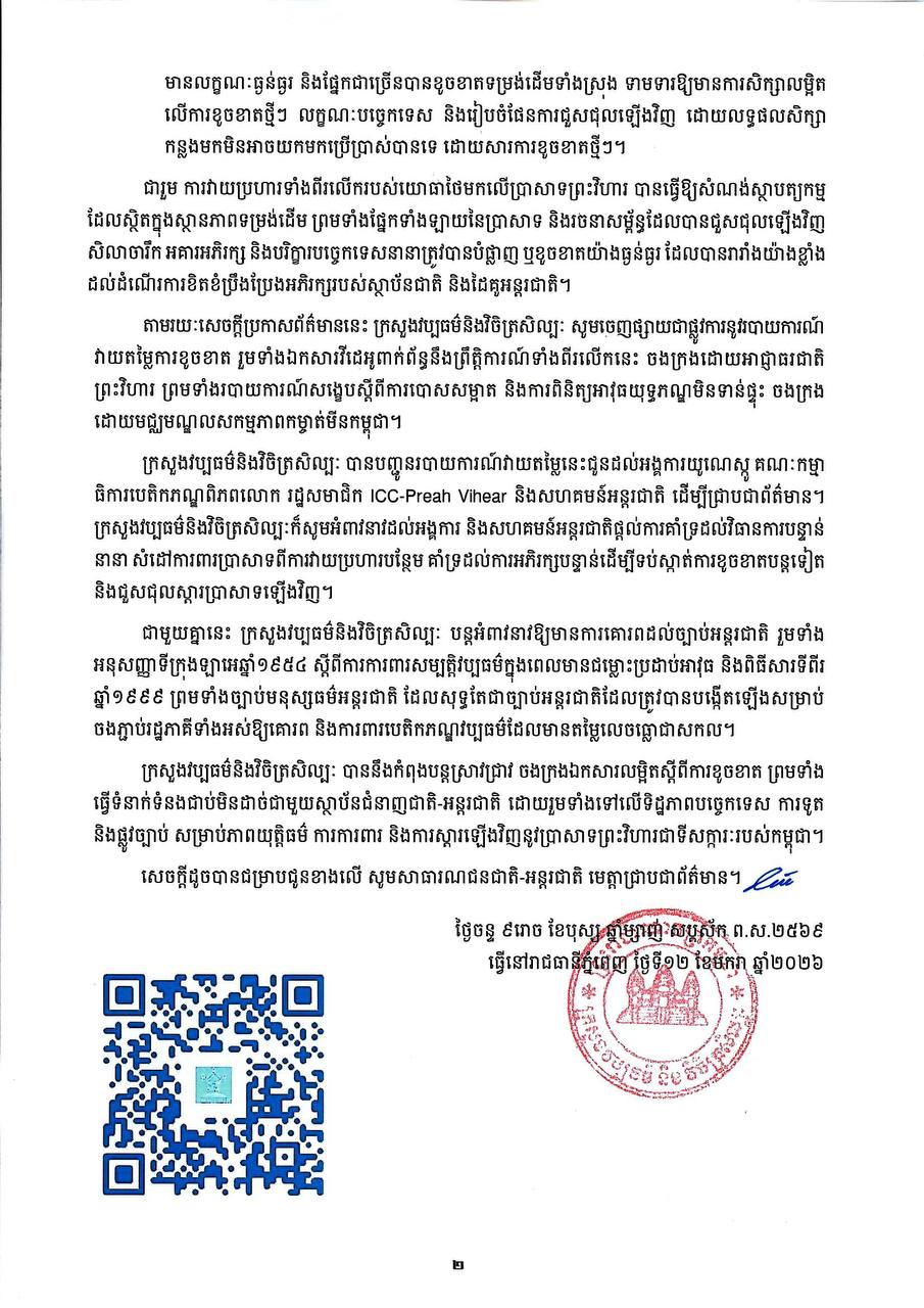 តាមរយៈសេចក្តីប្រកាសព័ត៌មាន ក្រសួងបានចេញផ្សាយជាផ្លូវការនូវ របាយការណ៍វាយតម្លៃការខូចខាត រួមទាំងឯកសារវីដេអូពាក់ព័ន្ធ និងរបាយការណ៍ស្តីពីការបោសសម្អាត និងពិនិត្យអាវុធមិនទាន់ផ្ទុះ ដែលបានបញ្ជូនទៅអង្គការយូណេស្កូ គណៈកម្មាធិការបេតិកភណ្ឌពិភពលោក រដ្ឋសមាជិក ICC-Preah Vihear និងសហគមន៍អន្តរជាតិ។
