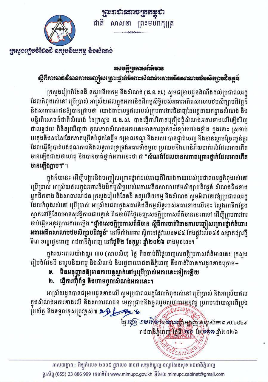 ដើម្បីបញ្ចៀសគ្រោះថ្នាក់ដល់អាយុជីវិត និងទ្រព្យសម្បត្តិរបស់អ្នករស់នៅ អ្នកជិតខាង និងសាធារណជន ក្រសួងបានប្រកាសថា នឹងចាប់ផ្តើមតម្លើងផ្ទាំងសេចក្តីប្រកាសព័ត៌មាននៅទីតាំងអគារ ចាប់ពីថ្ងៃទី០២ ខែកុម្ភៈ ឆ្នាំ២០២៦ តទៅ។