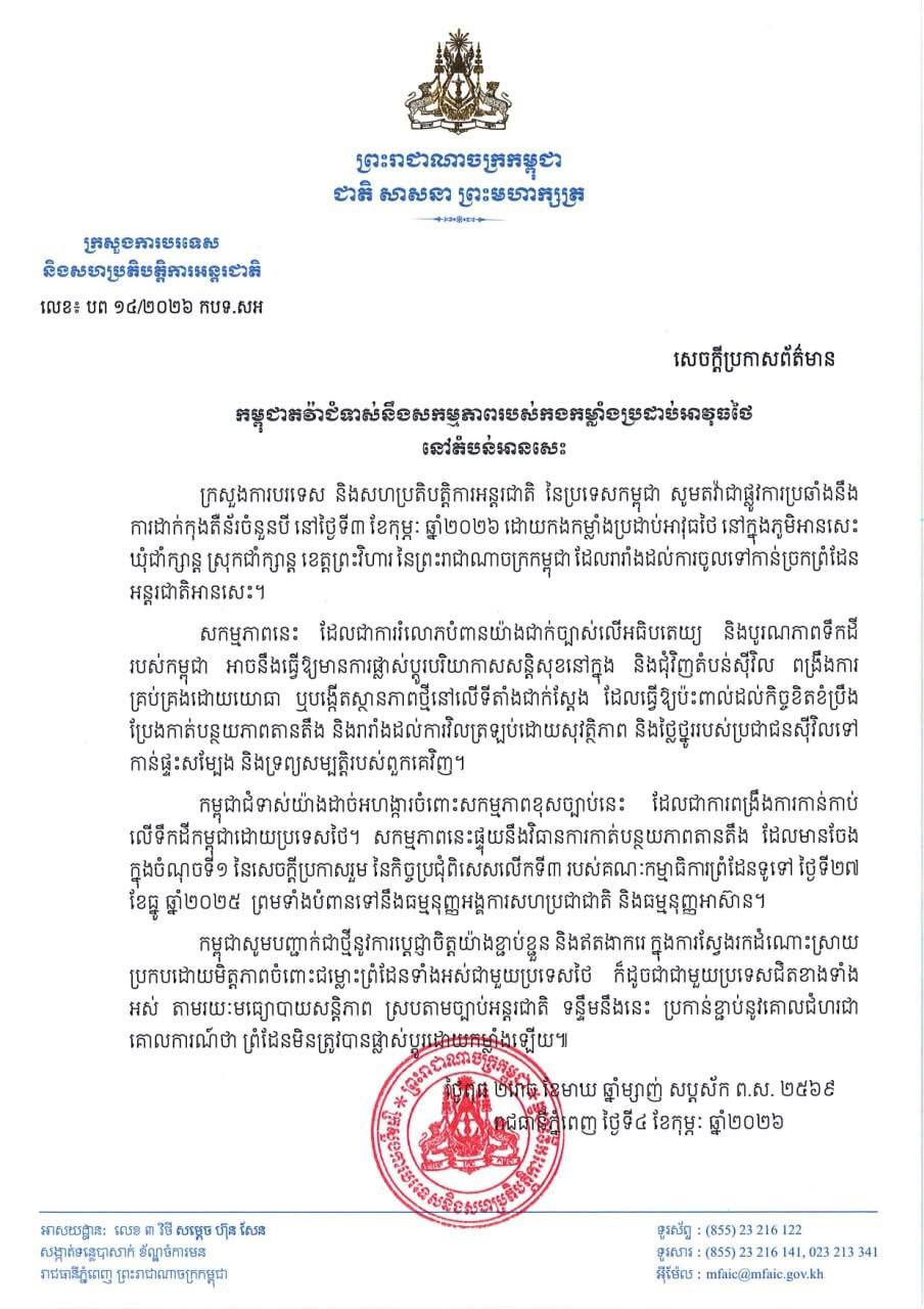 សកម្មភាពនេះផ្ទុយនឹងវិធានការកាត់បន្ថយភាពតានតឹង ដែលមានចែង ក្នុងចំណុចទី១ នៃសេចក្តីប្រកាសរួម នៃកិច្ចប្រជុំពិសេសលើកទី៣ របស់គណៈកម្មាធិការព្រំដែនទូទៅ ថ្ងៃទី២៧ ខែធ្នូ ឆ្នាំ២០២៥ ព្រមទាំងបំពានទៅនឹងធម្មនុញ្ញអង្គការសហប្រជាជាតិ និងធម្មនុញ្ញអាស៊ាន។