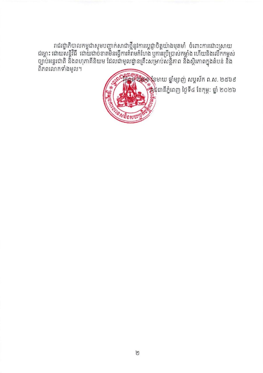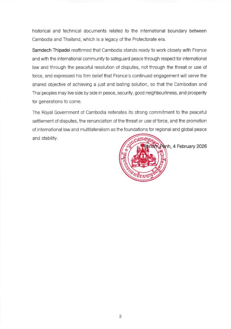 ភ្នំពេញ៖ ក្រសួងការបរទេស និងសហប្រតិបត្តិការអន្តរជាតិ បានបញ្ជាក់ថា នៅថ្ងៃទី០៤ ខែកុម្ភៈ ឆ្នាំ២០២៦ សម្តេចមហាបវរធិបតី ហ៊ុន ម៉ាណែត នាយករដ្ឋមន្ត្រី នៃកម្ពុជា បានផ្ញើលិខិតជូន លោក អេម៉ានុយអែល ម៉ាក្រុង ប្រធានាធិបតីសាធារណរដ្ឋបារាំង ដើម្បីឆ្លើយតបទៅនឹងឆន្ទៈរបស់បារាំង ក្នុងការត្រៀមផ្តល់ឯកសារប្រវត្តិសាស្ត្រ និងបច្ចេកទេសពាក់ព័ន្ធនឹងព្រំដែនអន្តរជាតិរវាងកម្ពុជា និងថៃ ប្រសិនបើមានសំណើពីកម្ពុជា។