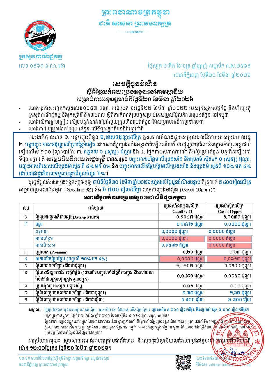 សម្តេចនាយករដ្ឋមន្ត្រីបានបញ្ជាក់ថា «ក្នុងដំណាក់កាលដ៏លំបាកនេះ រាជរដ្ឋាភិបាលកម្ពុជា បានអនុវត្តវិធានការសេដ្ឋកិច្ចតាមរយៈក្រសួងជំនាញពាក់ព័ន្ធ រួមមាន ក្រសួងសេដ្ឋកិច្ច និងហិរញ្ញវត្ថុ ក្រសួងពាណិជ្ជកម្ម និងក្រសួងរ៉ែ និងថាមពល ដោយផ្អែកលើសេចក្តីជូនដំណឹងស្តីពីថ្លៃលក់រាយប្រេងឥន្ទនៈនៅតាមស្ថានីយ សម្រាប់អនុវត្តចាប់ពីថ្ងៃទី២០ ខែមីនា ឆ្នាំ២០២៦»។