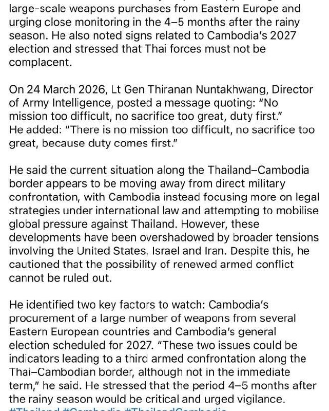 ភ្នំពេញ៖ នាយកមជ្ឈមណ្ឌលឯកសារកម្ពុជា លោក ឆាំង យុ បានលើកឡើងថា៖ សេចក្តីថ្លែងការណ៍របស់លោកឧត្តមសេនីយ៍ឯក ធីរ៉ាណាន ណាន់ថាខ្វាង ប្រធាននាយកដ្ឋានចារកម្មនៃកងយោធពលភូមិន្ទថៃ ដែលបង្កជាការងឿងឆ្ងល់មួយ អំពីការដែលកងយោធាថៃគួរតែបន្តការប្រុងប្រយ័ត្នខ្ពស់ ចំពោះការផ្ទុះឡើងជាថ្មីនូវអរិភាពពីសំណាក់កងទ័ពកម្ពុជា នៅរយៈពេលបួនទៅប្រាំខែខាងមុខ ក្រោយពីរដូវវស្សាបញ្ចប់។