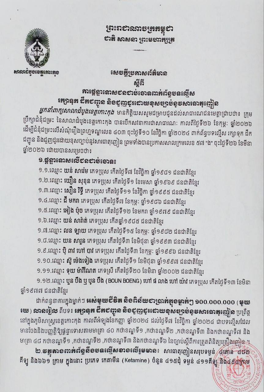 ជនជាប់ចោទទាំង១២នាក់ ត្រូវបានរកឃើញថា មានពាក់ព័ន្ធនឹងការប្រព្រឹត្តបទល្មើសគ្រឿងញៀនក្នុងភូមិសាស្ត្រខេត្តកោះកុង ចន្លោះពីខែកញ្ញា ឆ្នាំ២០២៤ ដល់ថ្ងៃទី៧ ខែវិច្ឆិកា ឆ្នាំ២០២៤ ដែលជាបទល្មើសធ្ងន់ធ្ងរ តាមបទប្បញ្ញត្តិនៃច្បាប់ស្តីពីការត្រួតពិនិត្យគ្រឿងញៀន។