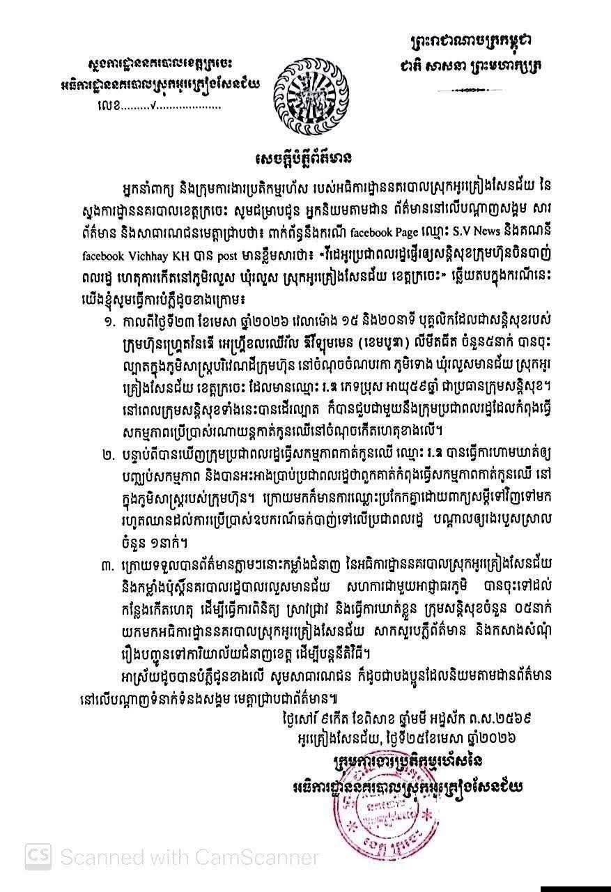 ឆ្លើយតបក្នុងករណីនេះ អ្នកនាំពាក្យអធិការដ្ឋាននគរបាលស្រុកអូរគ្រៀងសែនជ័យ បានបំភ្លឺថា កាលពីថ្ងៃទី២៣ ខែមេសា ឆ្នាំ២០២៦ វេលាម៉ោង ១៥ និង២០នាទី បុគ្គលិកដែលជាសន្តិសុខរបស់ ក្រុមហ៊ុន ហ្គេតវ៉ននើ អេហ្គ្រីខលឈើវ័ល ឌីវីទ្យុមមេន (ខេមបូឌា) លីមីតធីត ចំនួន ៥ នាក់ បានចុះល្បាតក្នុងភូមិសាស្ត្របរិវេណដីក្រុមហ៊ុន នៅចំណុច ចំណបរកា ភូមិទោង ឃុំរលួសមានជ័យ ស្រុកអូរ គ្រឿងសែនជ័យ ខេត្តក្រចេះ ដែលមានឈ្មោះ រ.ឌ ភេទប្រុស អាយុ៥៩ឆ្នាំ ជាប្រធានក្រុមសន្តិសុខ។ នៅពេលក្រុមសន្តិសុខទាំងនេះបានដើរល្បាត ក៏បានជួបជាមួយនឹងក្រុមប្រជាពលរដ្ឋដែលកំពុងធ្វើសកម្មភាពប្រើប្រាស់រណាយន្តកាត់កូនឈើនៅចំណុចកើតហេតុខាងលើ។