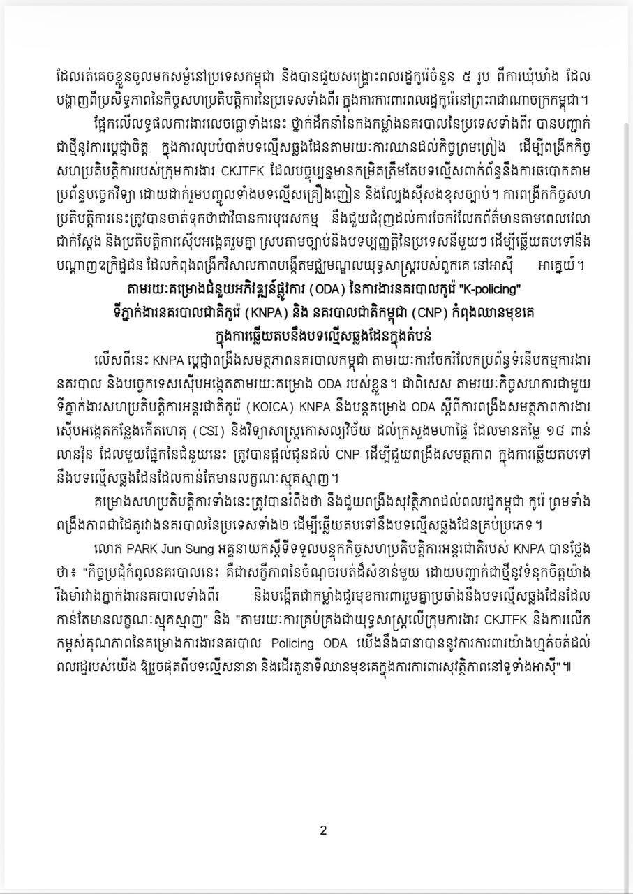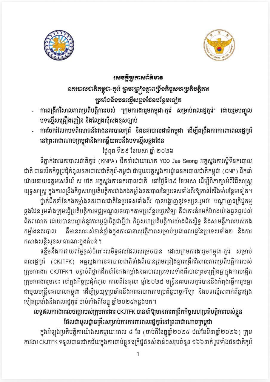 ភ្នំពេញ៖ នគរបាលជាតិកម្ពុជា និងនគរបាលជាតិកូរ៉េ បានឯកភាពពង្រឹងកិច្ចសហប្រតិបត្តិការបន្ថែមទៀត ក្នុងការ​ប្រយុទ្ធប្រឆាំងនឹងបទល្មើសឆ្លងដែន ដោយពង្រីកវិសាលភាពប្រតិបត្តិការរបស់ ក្រុមការងាររួមកម្ពុជា-កូរ៉េ សម្រាប់ពលរដ្ឋកូរ៉េ (CKJTFK)”