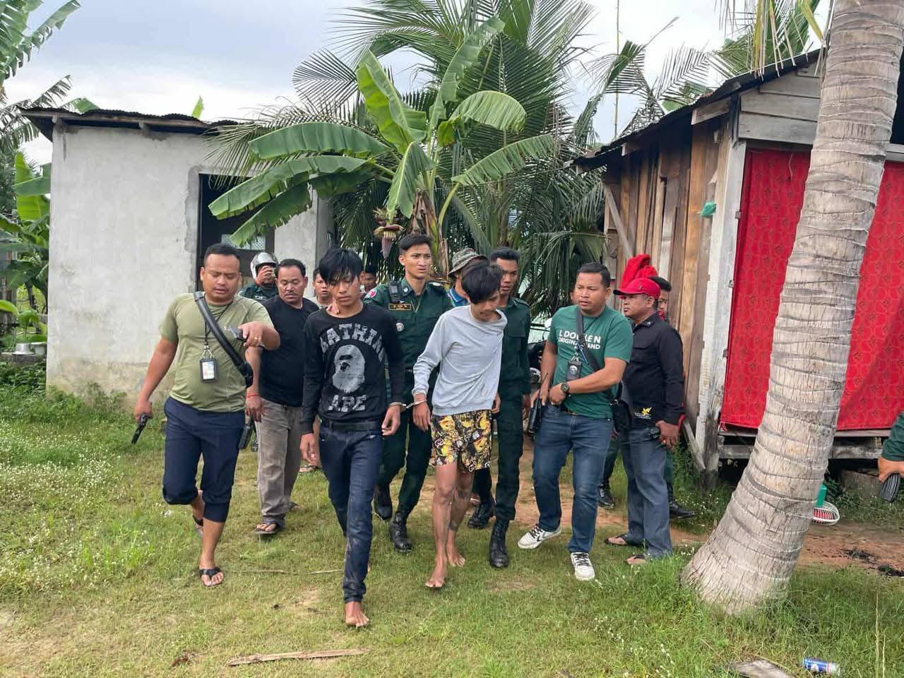 ភ្លាមនោះកម្លាំងល្បាតបានអន្តរាគមន៍ ឃាត់ខ្លួនបានជនសង្ស័យ ចំនួន ០២នាក់ រួមមាន៖ ទី១. ឈ្មោះ ធី ស៊ីធុយ ភេទប្រុស អាយុ ១៧ឆ្នាំ រស់នៅភូមិកណ្តោស ឃុំលំហាច ស្រុកអង្គស្នួល ខេត្តកណ្តាល មុខរបរ សិស្ស និងទី២. ឈ្មោះ មឿន ភក្ត្រា ហៅ ភ័ក្រ្ក ភេទប្រុស អាយុ ១៨ឆ្នាំ រស់នៅភូមិថ្មសំលៀង ឃុំត្រពាំងគង ស្រុកសំរោងទង មុខរបរ កម្មកររោងចក្រ ដកហូតវត្ថុកាំបិតផ្គាក់ ១ ម៉ូតូហុងដា C125 ឆ្នាំ២០២១ ពណ៌ខ្មៅ ស្លាកលេខ កំពង់ស្ពឺ 1T-9088 ដោះទុកក្រោមកែប។